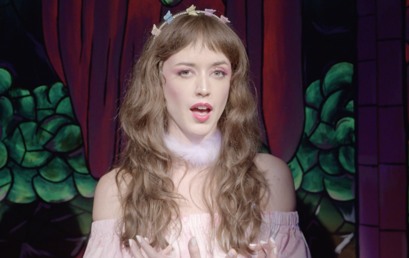 The exhibition culminates with Gwenmarie White’s video “Skjemt Blod” (“Bad Blood”), which fills the back wall of an isolate room. The title is a nod to the lineage of Norwegian Black Metal and to Taylor Swift’s infamous pop tune, of which White’s video is something of a complicated homage. White’s video opens with a scene of rosy, jubilant cheerleaders receiving gifts of folded pillowcases. Since the video has been slowed, the handling and caressing of these material offerings reaches a near-sacred intensity. All the while, a shrill but ambient soundscape is mounting to fever pitch. As the primary cheerleader slowly raises a flaccid pillowcase to her powered face, looking like Mother Mary in a baby-blue pleated skirt, the sound shifts: a choir of female voices rush in and the scene cuts to a stained-glass window depicting a robed, black-metal queen before panning to the heavily made-up choir. Suddenly, the choral voices play backdrop to a new lead vocal (Bridget Galanis), who pelts out the first audible line of Taylor Swift’s hit tune, but shriller, laid down in minor key. Then hell, quite literally, bursts through: a Norwegian black metal cover of “Bad Blood” crackles the amp in the corner of the tiny room. The choir of angels turn satanic, the cheerleaders begin a pillow fight which mutates into a violent act akin to tar and feathering, the black metal band keeps on playing.