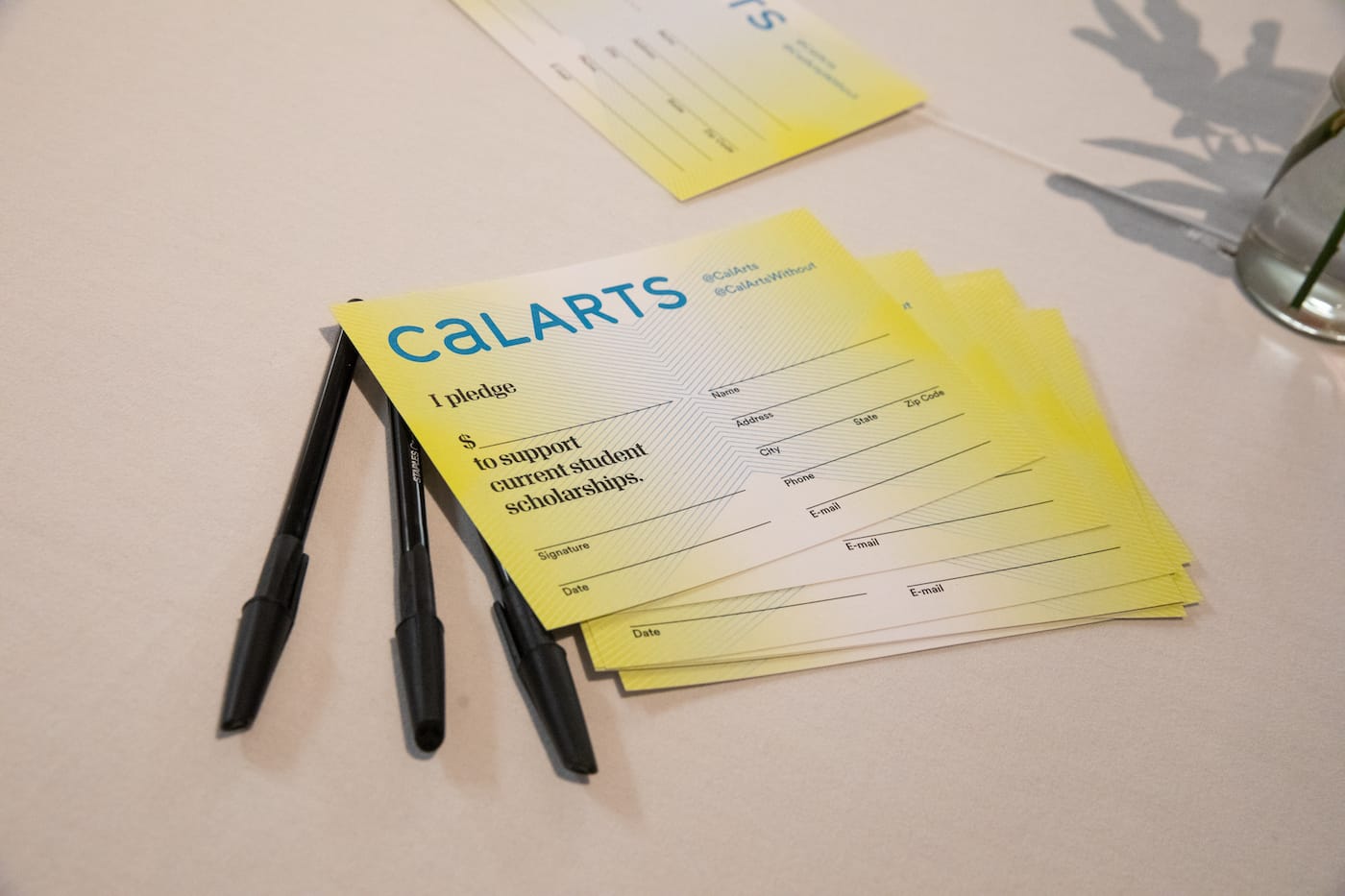 Ali and fellow MFA classmate Andrew Siedenburg took turns reading a heartfelt letter to the crowd. After wrapping up their speech to a standing ovation, the students distributed pledge cards to the guests. In an effort to show support, President Rajan’s office helped design the cards and will direct all the funds to student scholarships. James Wolken, Executive Director of Marketing at CalArts, says that they raised roughly $20,000 that night.