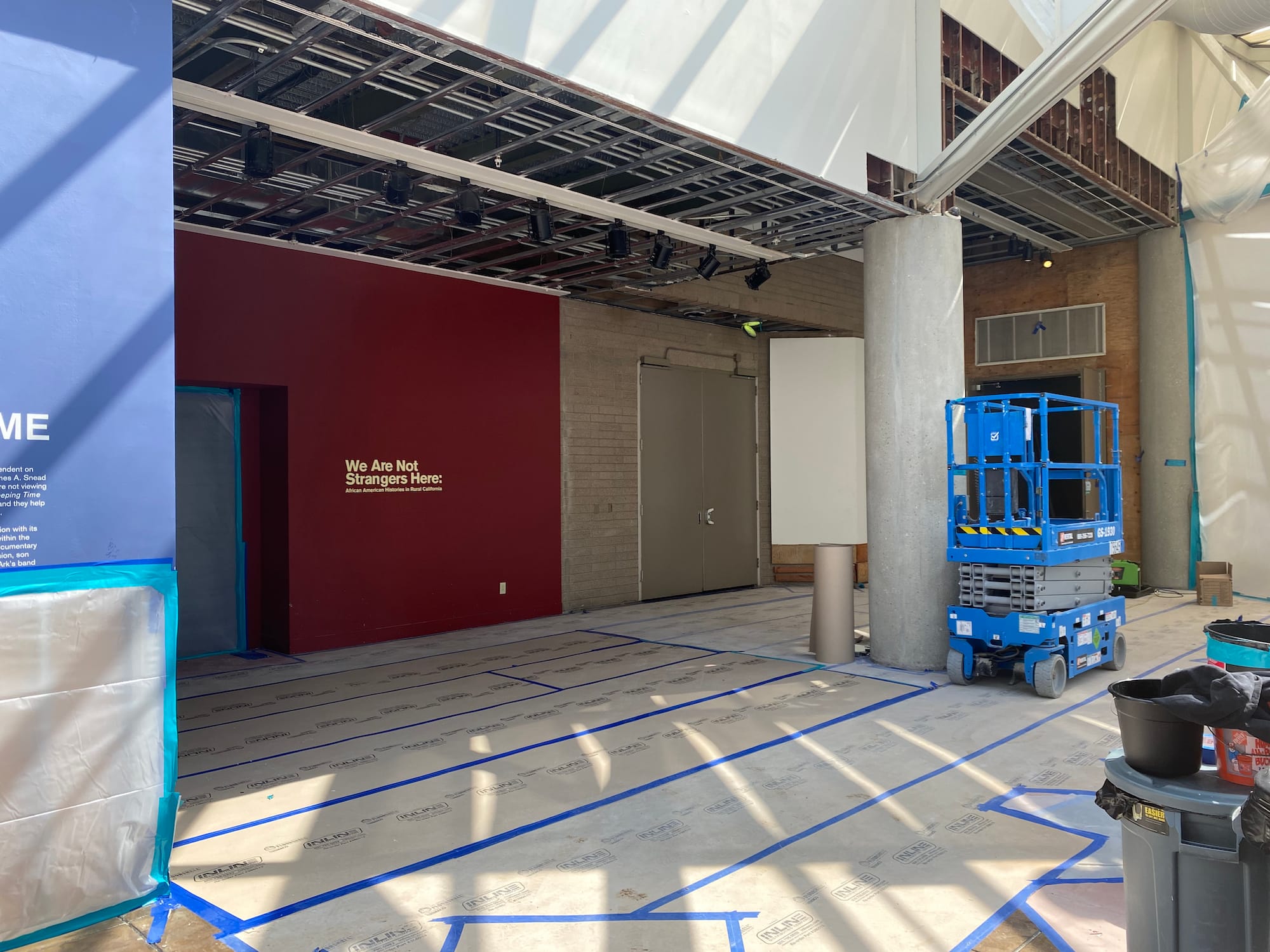 Currently, Fazlalizadeh’s installation can be glimpsed through the museum’s windows, alongside signs of construction including scaffolding, fans, and plastic sheeting. A sign reading “Closed for storm-related repairs” is painted on the museum’s doors in large yellow letters. Last week, workers from Cal-City Construction, the firm responsible for the recent upgrades and the current repairs, could be seen on the museum’s roof, though none were authorized to speak with Hyperallergic. Cal-City did not respond to Hyperallergic’s request for comment by press time.
