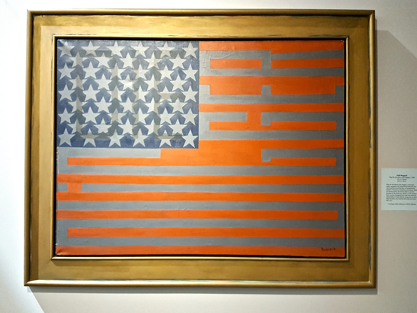 This manifests in moments that range from exquisite to challenging, sometimes simultaneously. Much of the work is figurative, and visitors are greeted by largely recognizable imagery, such as two mixed-media portraits of young black women by Jamea Richmond-Edwards, or photographs from Civil Rights protests in 1960s New York by Gordon Parks. A second theme touches on symbols, including renderings of iconic Civil Rights Movement leaders, as well as many takes on flags, from “Trump Edition” (2017) by Detroit native John Sims (known for his extensive work with flags), and Faith Ringgold’s “Flag for the Moon (Die Nigger)” (1969).