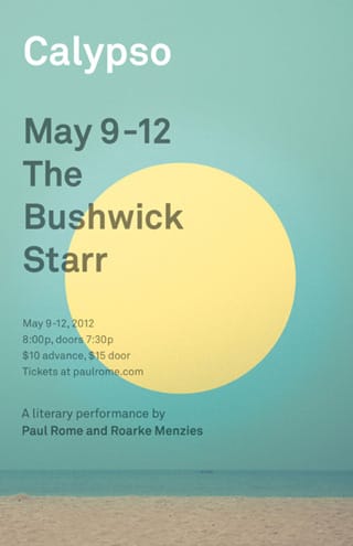 His latest mutt of theater, short story and music, Calypso, ran earlier this month at the Bushwick Starr. Rome took the stage with sometimes collaborator Roarke Menzies — who also composed a score — but they didn’t do much with the Starr’s modest space. As at any reading, the microphone was the whole of the stage.
