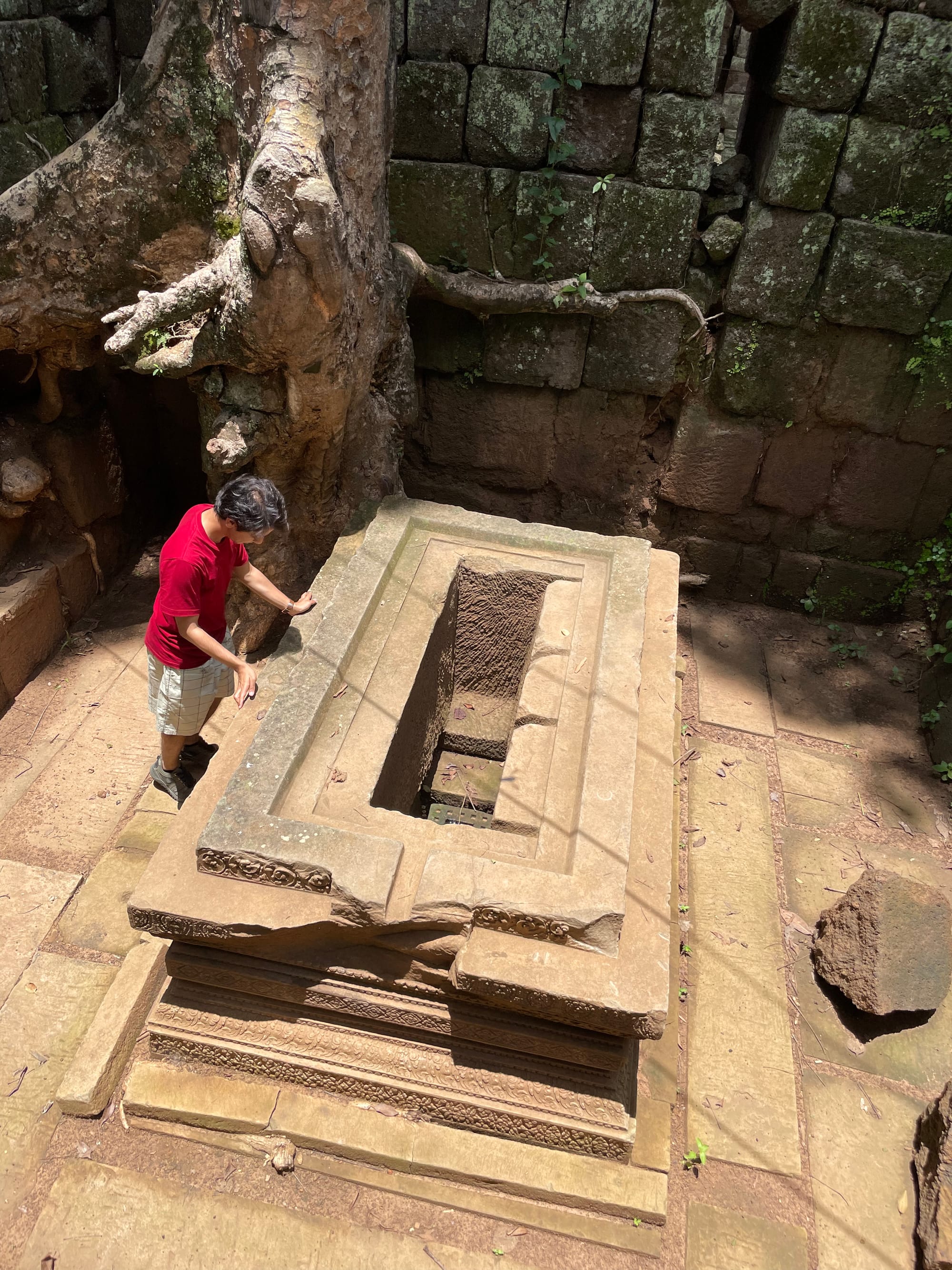 Visiting the temple sites from which the artworks were stolen could not be more different than strolling through the museum. As I wandered the halls of Angkor Wat temple complex and climbed the seven-tiered pyramid at Koh Ker this summer, my shirt was soaked in rain and sweat, my shoes were red with mud, and my pant cuffs fringed with hooked seeds from the vegetation continually trying to creep a little closer to the ruins. Sometimes, the soundtrack to my visits was the conversation in many languages of other tourists. At more remote sites, I heard bells tinkling around the necks of grazing cattle or the crinkling hiss a column of ants makes on its way through the forest. Unlike the scentless museum, I could always smell the trees, with occasional whiffs of the incense lit by Cambodians as an offering to the spirits many believe still reside in these sacred sites.