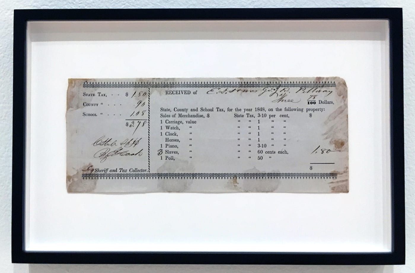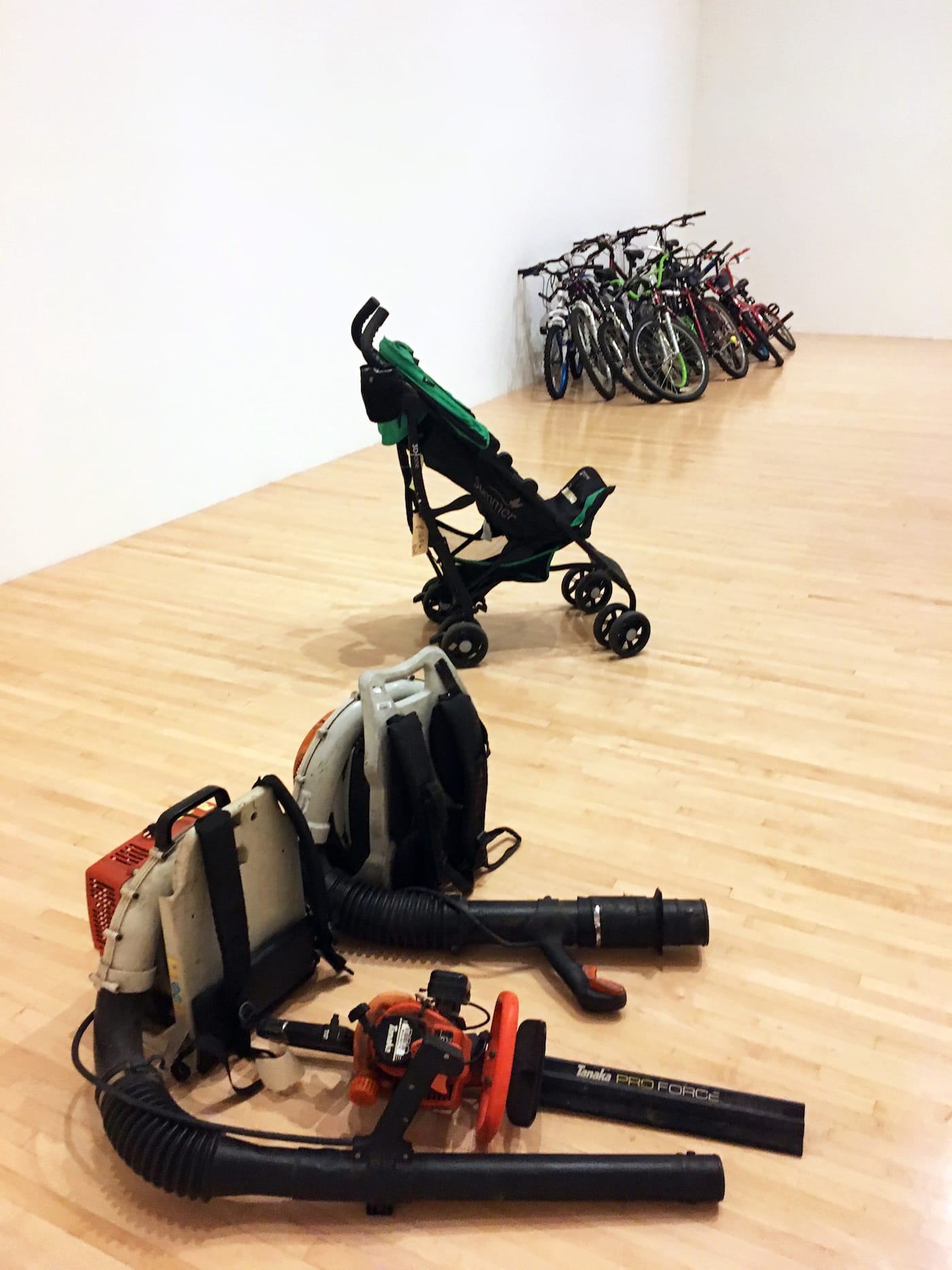 LOS ANGELES — At first, the readymade objects in Cameron Rowland’s D37 look like they have little in common. Among them are a leaf blower, 19th-century tax receipts, land assessment paperwork, a stroller, and two cluster of bikes. There are no wall didactics to clarify the relationships between the items in Rowland’s one-room exhibition at the Museum of Contemporary Art, Los Angeles, which resembles a picked-over garage sale more than fine art.