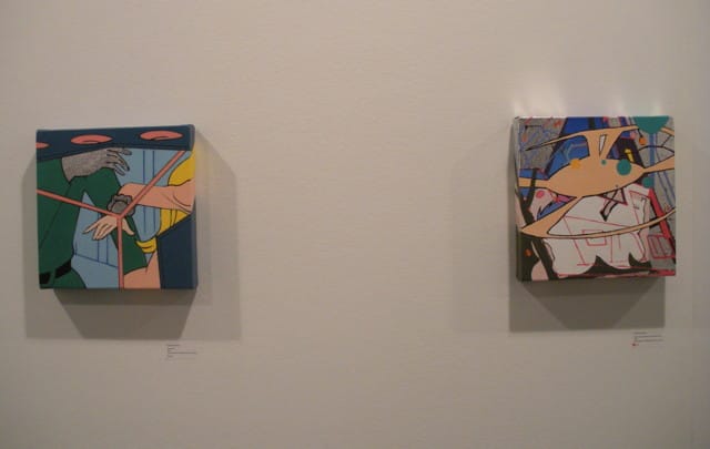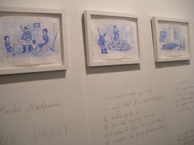 Like these works, much of the best art at the fair seemed to have a sense of humor. Not to the point of shtick, mind you, but there’s just so much seriousness, and self-seriousness, in Miami, that the artists avoiding it were the ones who drew me in. Tomoki Kurokawa‘s small paintings at Nanzuka gallery, for instance, borrow visual tropes from manga but remix them into something surreal. One of my favorite pieces was an installation by Estonian artist Marko Mäetamm at the booth of Temnikova & Kasela Gallery. Mäetamm created blue watercolors and accompanying text for a series called Our Daddy Is a Hunter, and while the story sings the praises of the unnamed father, with his hunting gun and knife and big pants, the images show him hunting and ultimately netting his family. It’s dark stuff, but also funny; as the gallerist told me, “You know, it’s Estonia, not Greece. They don’t take everything so seriously.”