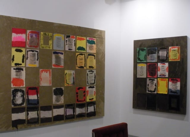 The fair actually seems surprisingly similar to ABMB in its penchant for 2-D works; painting, in particular, is present in strong doses. Quirky, self-conscious plays on geometric abstraction can be seen every two or so booths, which struck me as something of a throwback. A few examples stood out, all of them practices that deviate from the rules by playing with and calling attention to their materials: Joe Fyfe‘s collage pieces incorporate fabric shapes alongside painting; Shila Khatami uses lacquer on aluminum to create unconventional surfaces; and Jess Fuller turns lines into blotches and rectangles into patches, as well as shredding her material selectively but mercilessly.
