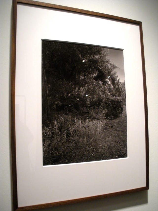 A handful of other galleries are showing work that similarly springs from clever or smart ideas, with great aesthetic results. Justin Berry‘s mini solo booth at Interstate Projects, in the Nada Projects section of the fair, features three digital prints. For one of them, Berry photographed two covers of the same book side by side and then digitally manipulated them to remove the text. The resulting, nearly twin pictures are pastel landscapes that in any other context would probably look cheesy; somehow, here, they’re entrancing. His two other photos appear at first glance to be simple black-and-white landscapes, but it turns out they’re nature scenes shot within video games. Virtual space has rarely looked so real.