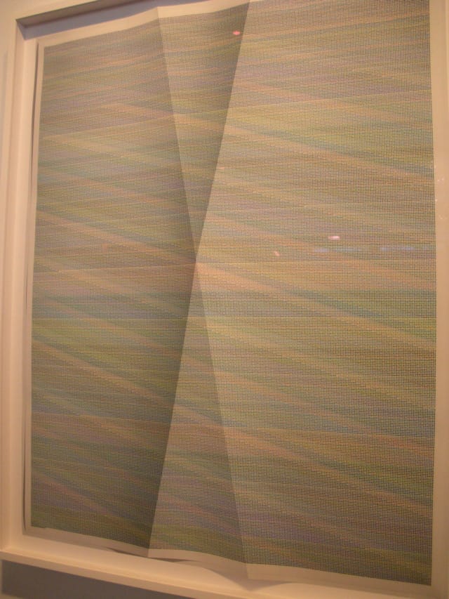 John Houck is also moving from the digital realm to the physical, and his mesmerizing prints command a wall at On Stellar Rays. Houck has a long, intense process for these works: He uses software that he wrote to generate every possible combination of a given number of rows, columns, and colors. He then uses another program he wrote to create an index print of the combinations on a single sheet of paper. Finally, he creases the paper, lights it, and photographs it a number of times. The final print looks like an infinitely dotted, striped rainbow, and it contains both illusionistic creases and real ones.
