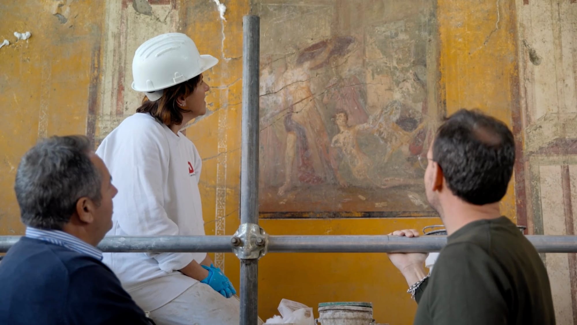 Meanwhile, back at the ancient bakery featured in the first episode, the Italian excavators continue to piece together more of the city block in the wealthy district that their colleagues previously explored. After tracing the source of running water and drains in the bakery, archaeologist and historian Miko Flohr explores whether the structure next door was a laundering facility known as a fullery. As he explains on-site, owning large laundry facilities opened the doors to the upper echelons of society in the city’s “sharply unequal” business community. The two stories interwoven in the episode — one about wealthy businesspeople living in the city and another about identifying the mass of people who fled — provide a striking picture of daily life and its obliteration by the sudden volcanic eruption.