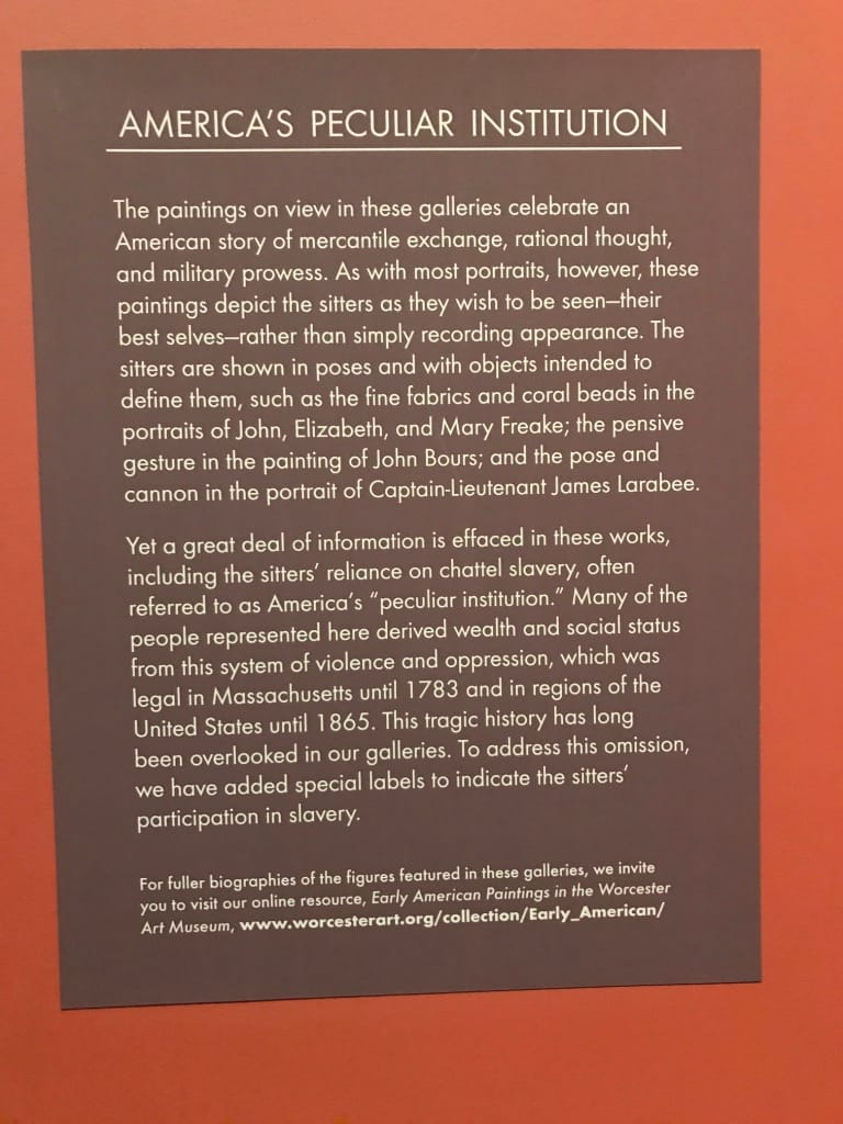 I must admit that I am anecdotal proof that this new signage has an impact. I am not an expert in American art — I usually go straight to the ancient mosaics at WAM. But I was struck hard by these new labels. I am an ancient historian but also a white woman from the South who now teaches a course on slavery and marginal peoples in antiquity in a small Midwestern city. Until I read these labels, I really did not know much about how early American art in New England was influenced by slavery; like many, I tied slavery predominantly to the South. I came away with a new understanding of the accumulation of wealth that underpins the art world then and can still support it today. At the same time, I was also reminded that enslaved persons were not always invisible participants in the art world.