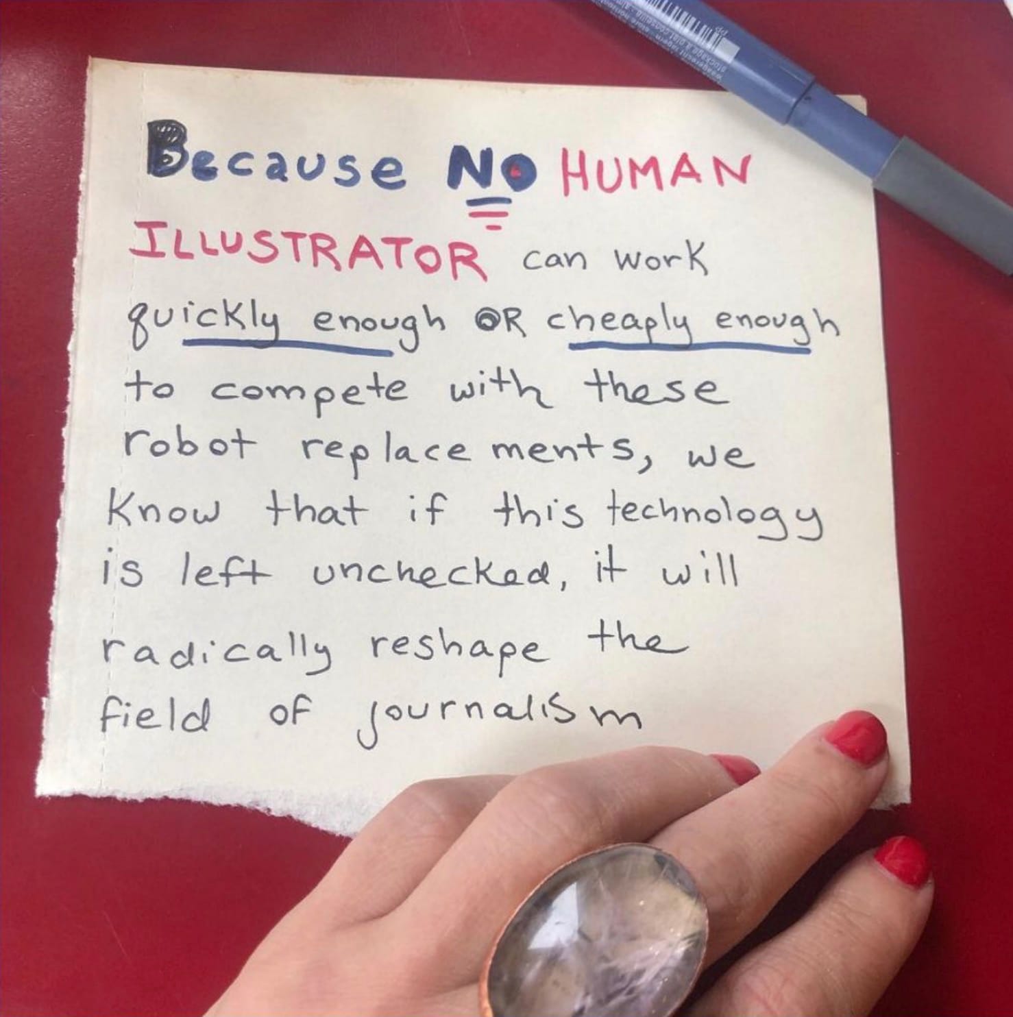 Crabapple has already seen the effects of AI on her industry. Several illustrators she knows have struggled to obtain work as companies and publications seek to lower costs by using AI prompts to create images instead of paying artists or photographers. In 2023, she wrote an open letter imploring publishers, editors, and journalists to reject using generative AI programs, which more than 4,000 people have signed.