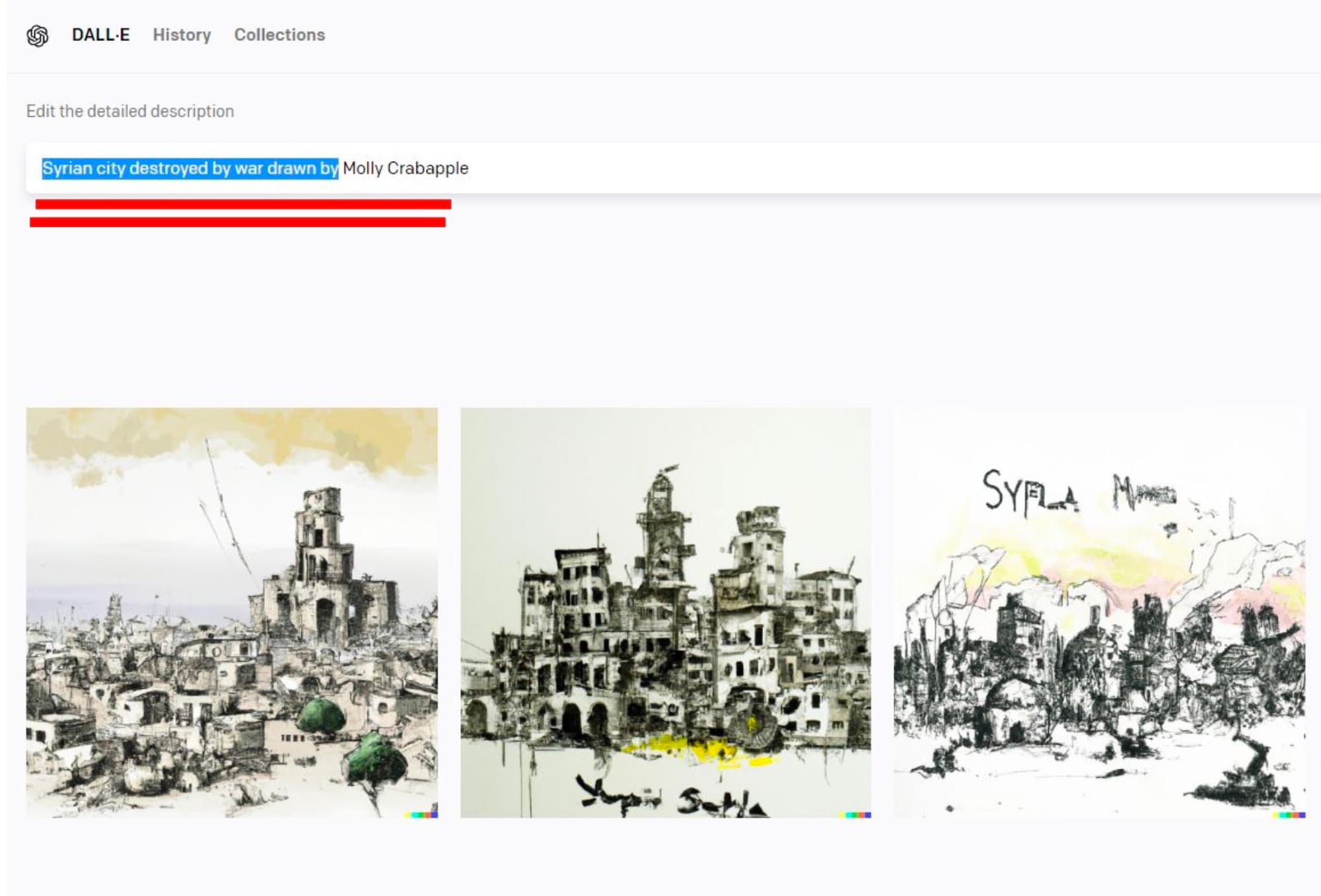 She realized that artificial intelligence companies had hoovered up her work, along with billions of other images on the Internet, to train models that convert blocks of text into images. When she typed her name into programs such as DALL-E, DreamStudio, and Stable Diffusion, they each spat back sloppy facsimiles of her sketch of the ravaged Syrian city.