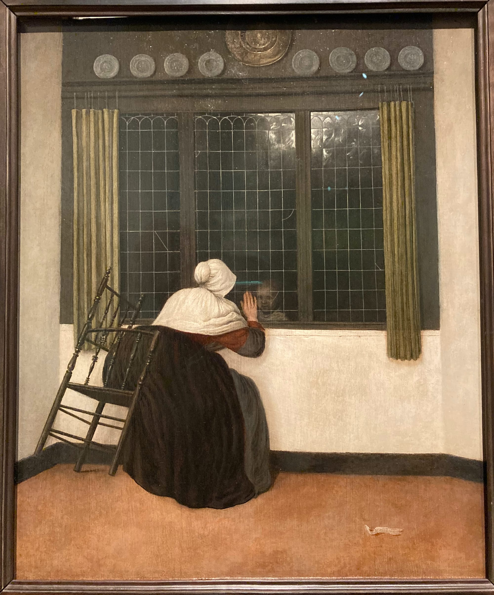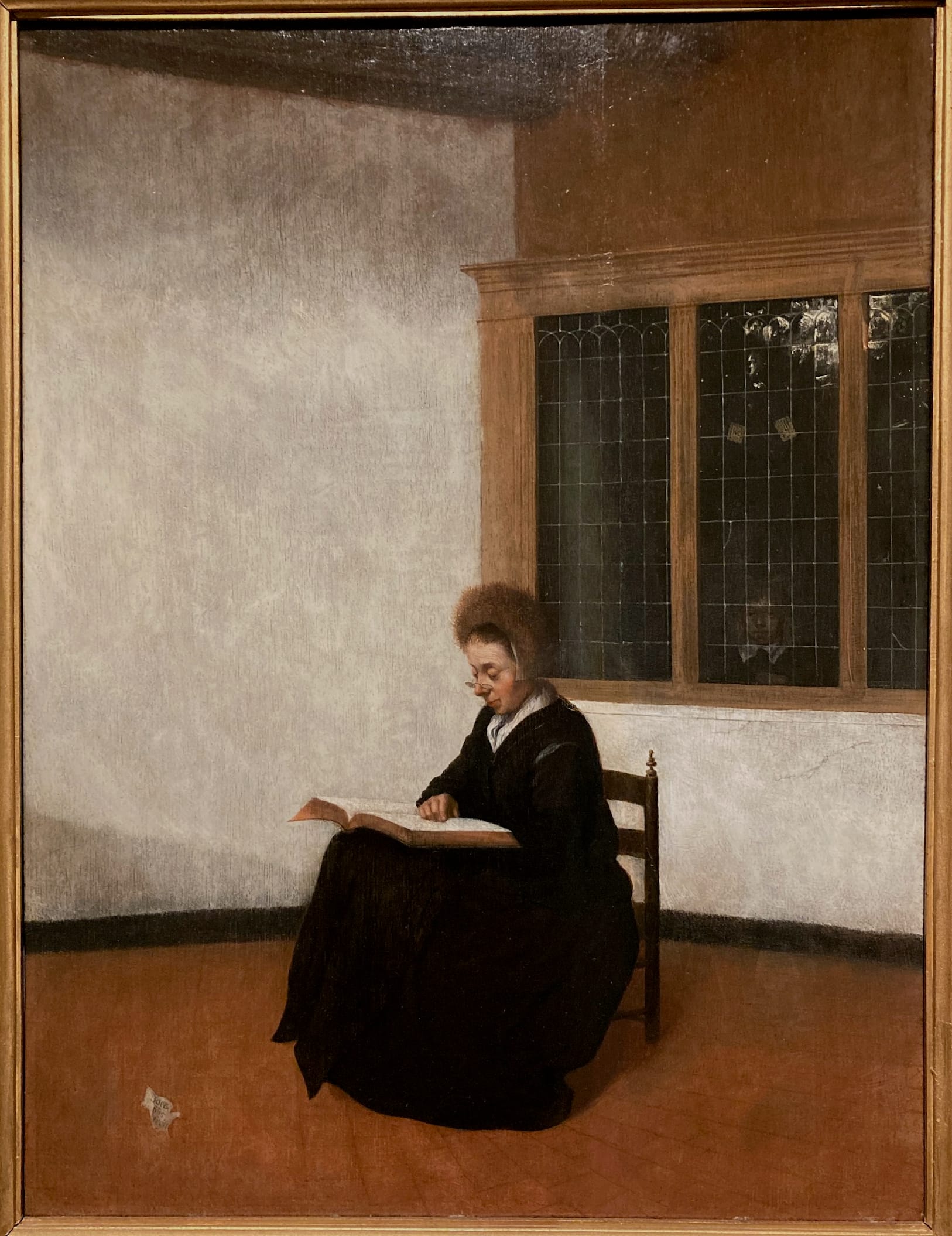 What we know about Vermeer, which is less than we’d like, dwarfs what we know about Vrel, which is close to nothing. Only one painting bears a date, 1654, which shows him painting women in interiors when Vermeer was still trying out history paintings. The 10 or so paintings on view are clumsier than Vermeer’s but share the mystification of the everyday and a fascination with women and windows. Two of the most striking feature interior windows with a child appearing, ghostlike, behind the glass. In one, a woman leans over in a chair precariously, as if to touch the child through the glass; in another, an older woman with a pince-nez and a book studiously ignores the child’s presence behind her. The paintings’ naïveté both accentuates Vermeer’s mastery and opens another door into the Dutch interior.