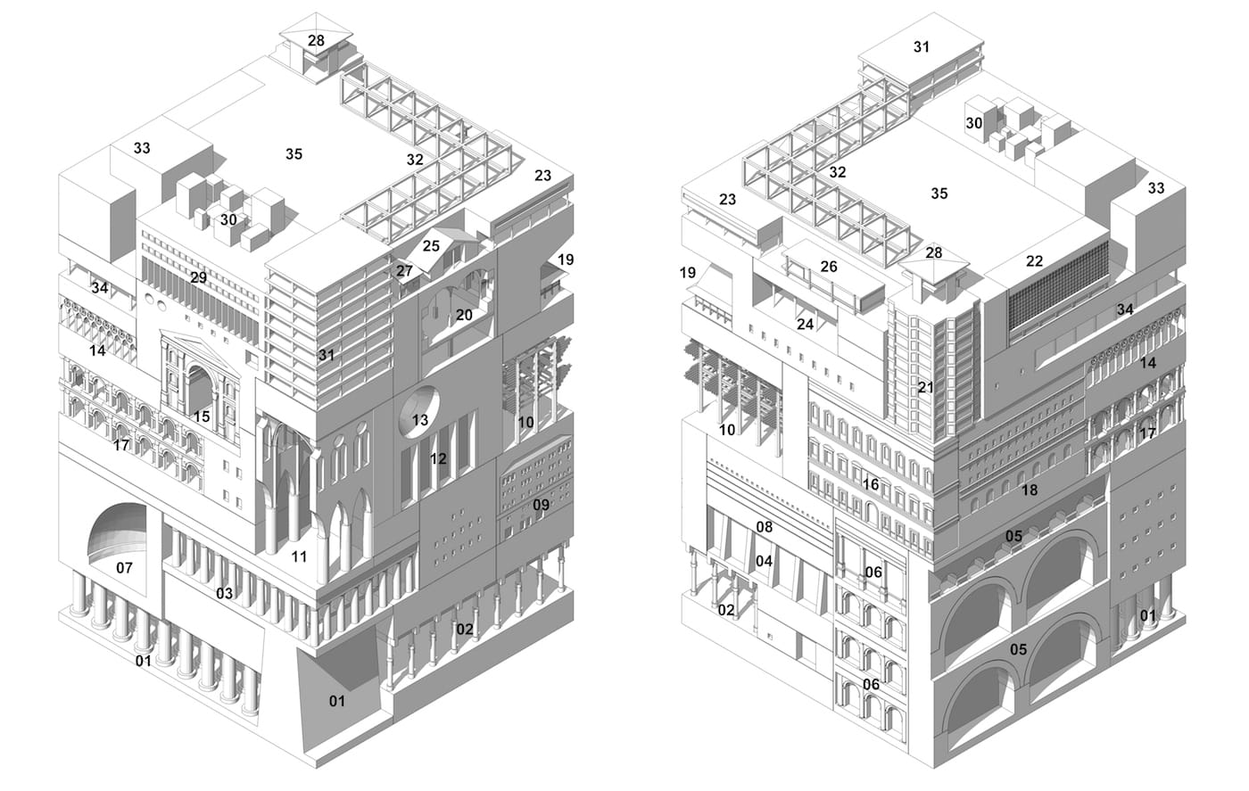 Test your knowledge of architectural history with this elegant, 3D-printed puzzle, which seamlessly collages elements from over 30 iconic buildings together to form one rectilinear model. Designed by architect Fumio Matsumoto, “Memories of Architecture” features façades, walls, colonnades, and other structures from significant buildings that date from ancient Egypt to the present day. They are stacked mostly chronologically, from the ground up, to reveal similarities and shifts in styles across time and geographies.