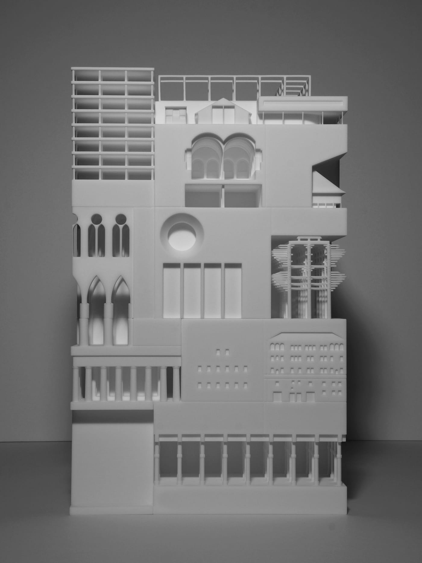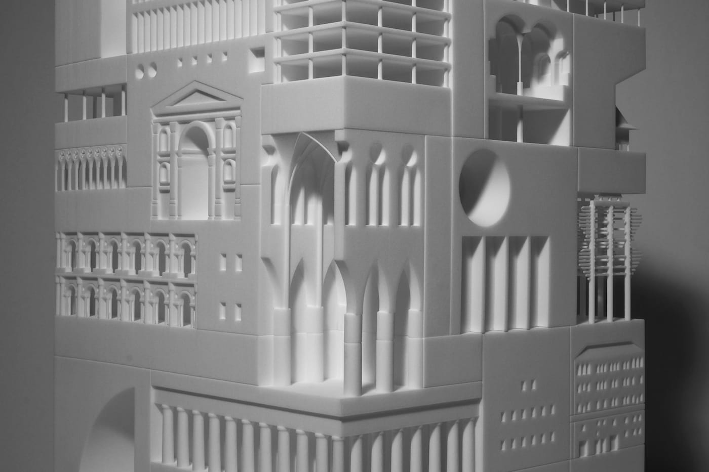 Printed as a single object that itself resembles a funky tower, the model includes architectural feats such as the great hypostyle hall from the Karnak Temple, the nave of Reims Cathedral, and a mini version of Chicago’s Reliance Building — revolutionary in the 1890s for its glass-covered exterior.