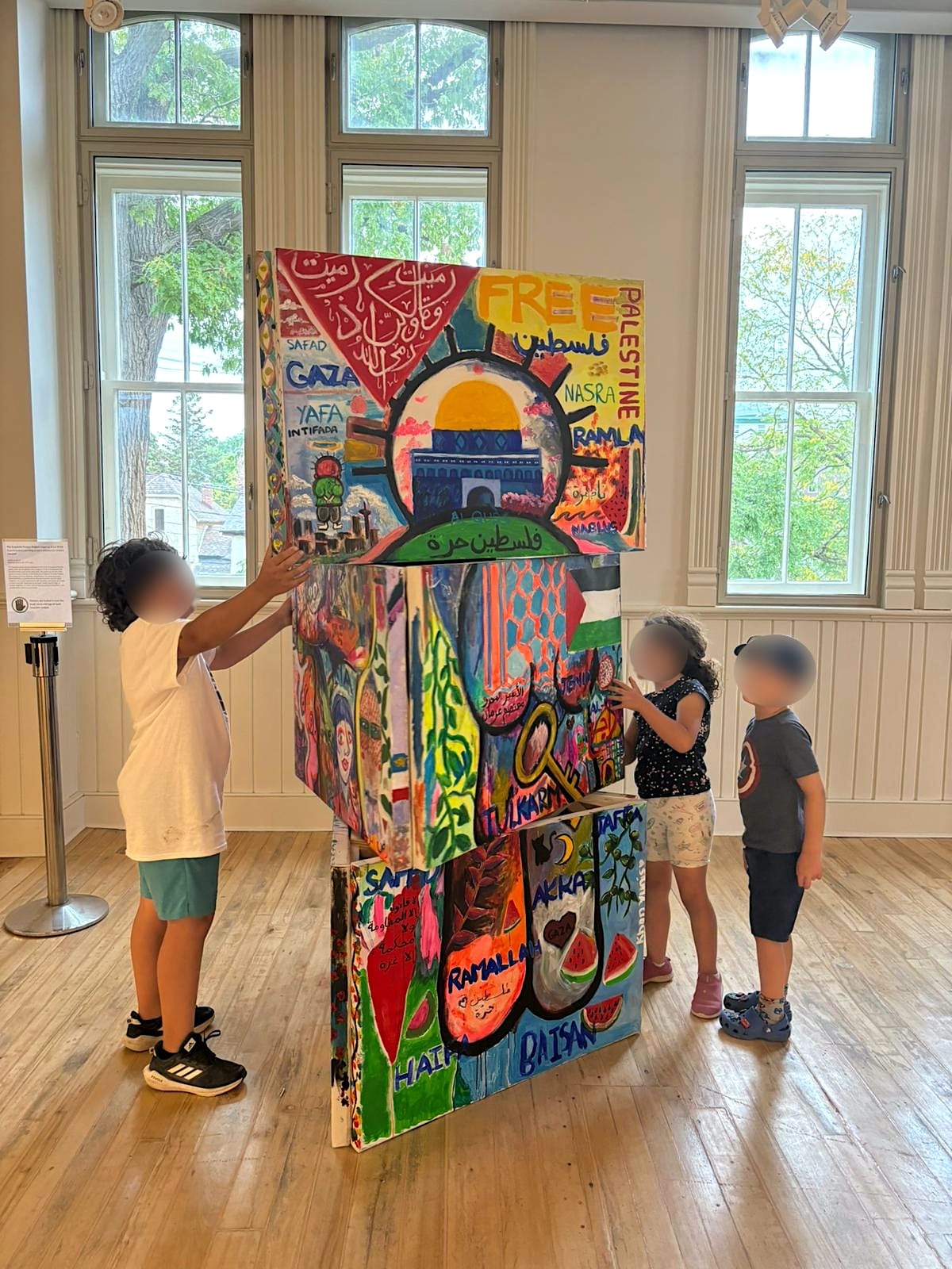 Hassard’s “Exquisite Corpse Project,” a co-created participatory work, was partially painted by students in the University of Toronto at a Palestine solidarity encampment. On the rotating sections, artists collaborated on images of a Palestinian flag and the Dome of the Rock, an Islamic monument at the Al-Aqsa mosque in Jerusalem, and wrote words including “Gaza” and “Intifada.”