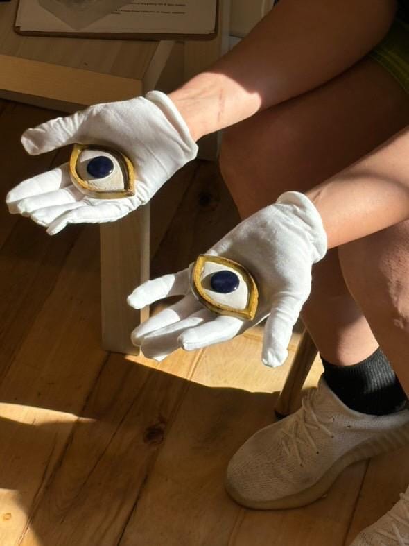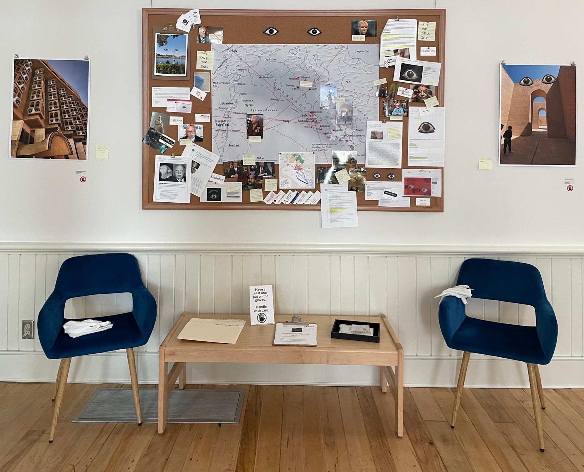 Alsalman’s piece invited viewers to look through the eye inlays, based on ancient looted artifacts from statues during the United States’s invasion of Iraq and sold at major auction houses, and a table holding various related items. Above the table was a map of ancient Mesopotamian cities.