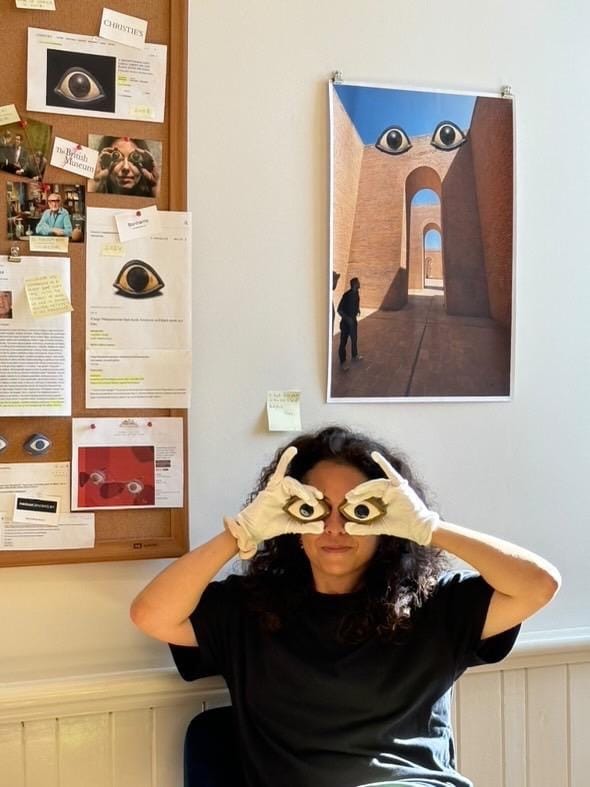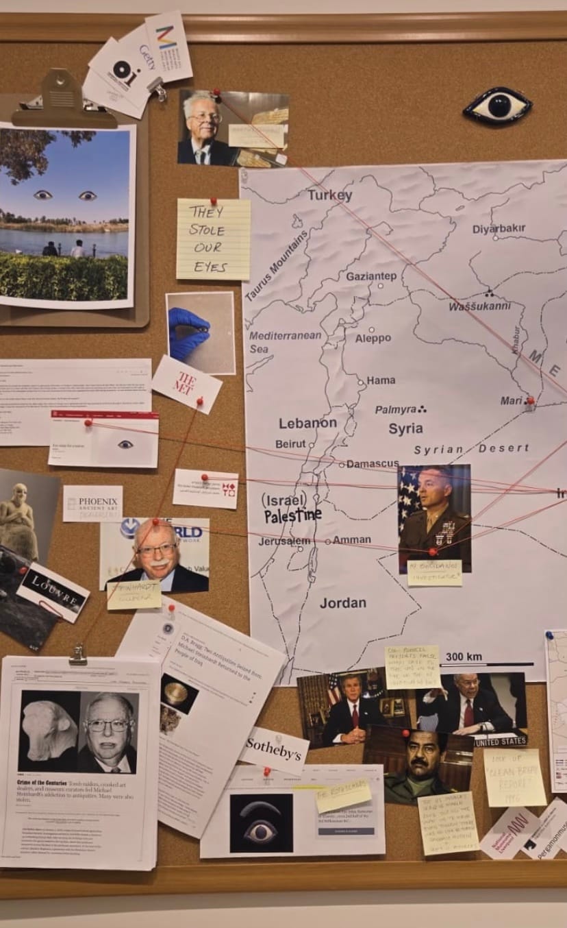 Alsalman told Hyperallergic that in a Zoom meeting with center’s director, Suzanne Haines, she asked was specifically asked about her investigative installation entitled “They Stole Our Eyes (but We Still See),” born out of Alsalman’s journalistic research into Iraq’s looted antiquities black market.