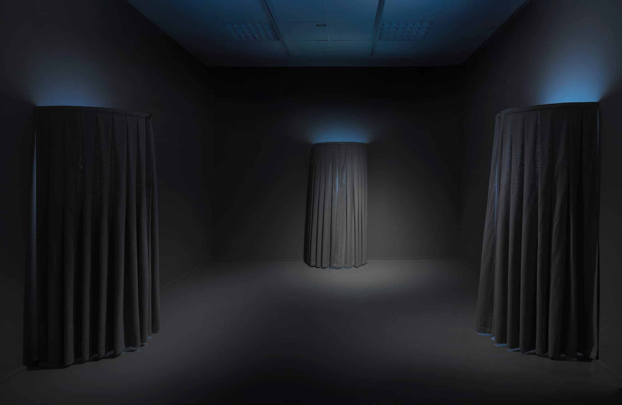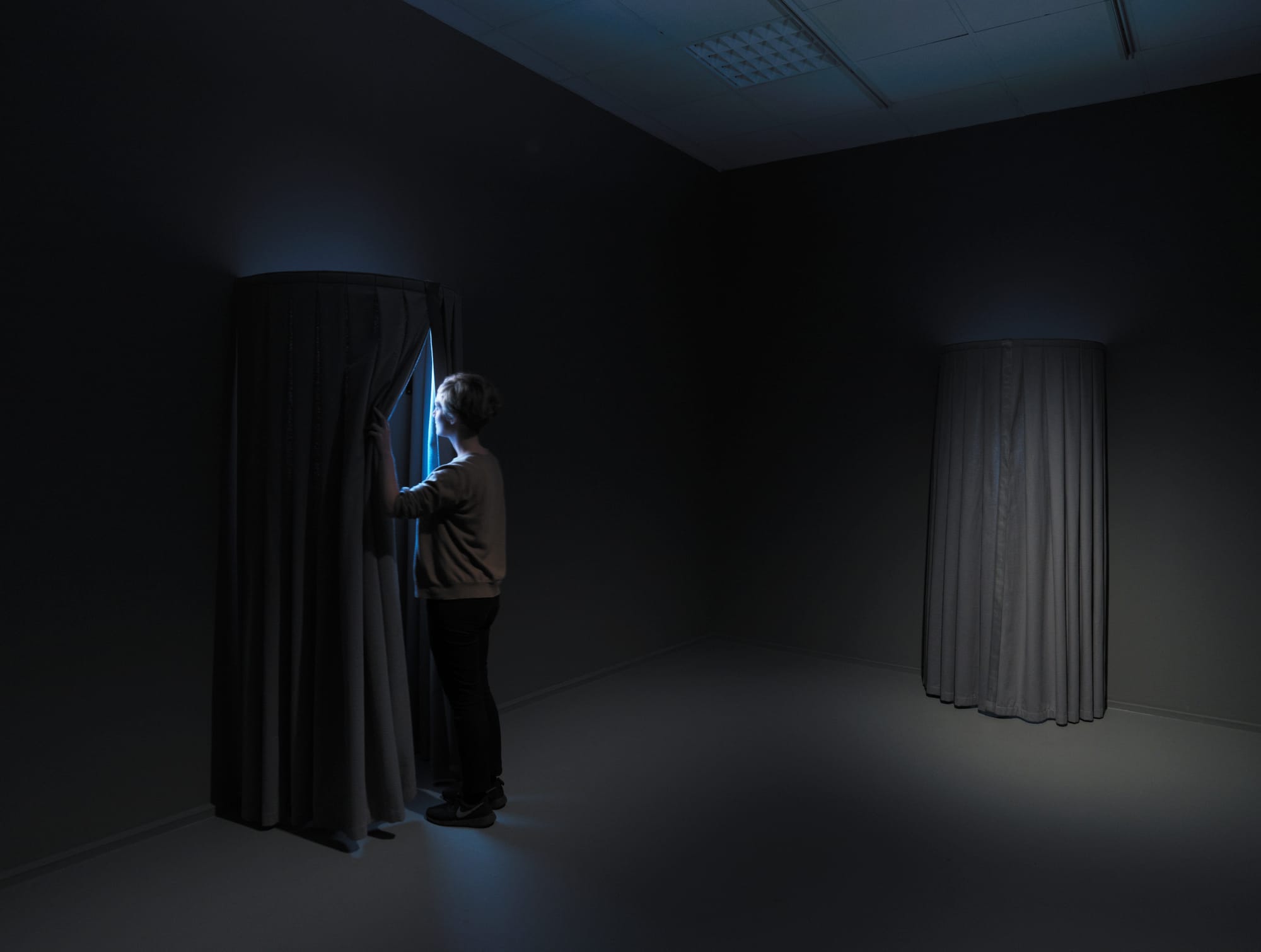 Labour is a series of four short, single-channel video loops played in reverse. Each is hidden behind a gray curtain, so only one person can see the videos at a time. Once parted — perhaps a yonic gesture? — the curtains reveal intimate documentary footage of women giving birth. Opening with a baby cradled in a woman’s arms, the videos end with screaming, blood, and a newborn pushed inward.