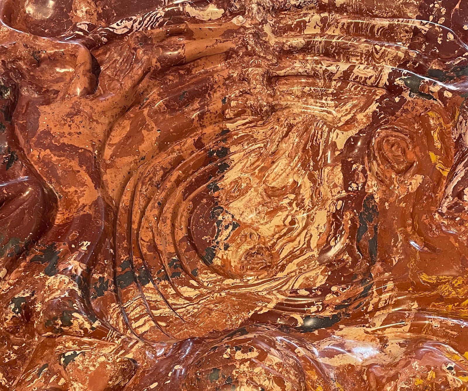 Two sculptures composed of textured surfaces on table-like bases sit just outside the main space. “Tactile Theater #1 (After Noguchi)” and “Tactile Theater #2 (After Švankmajer)” (both 2021) are best experienced with another person. As Lin states in a video on the gallery’s website, viewers are intended to hold each other’s gaze as they sweep their hands across the dips and curves of the surfaces, which reveal themselves to be a mélange of ribs, ears, and nostrils. Here, the discovery of these obscured body parts can only be achieved by the softening of our own corporeal boundaries as hands crash into, loop around, and overlap each other.
