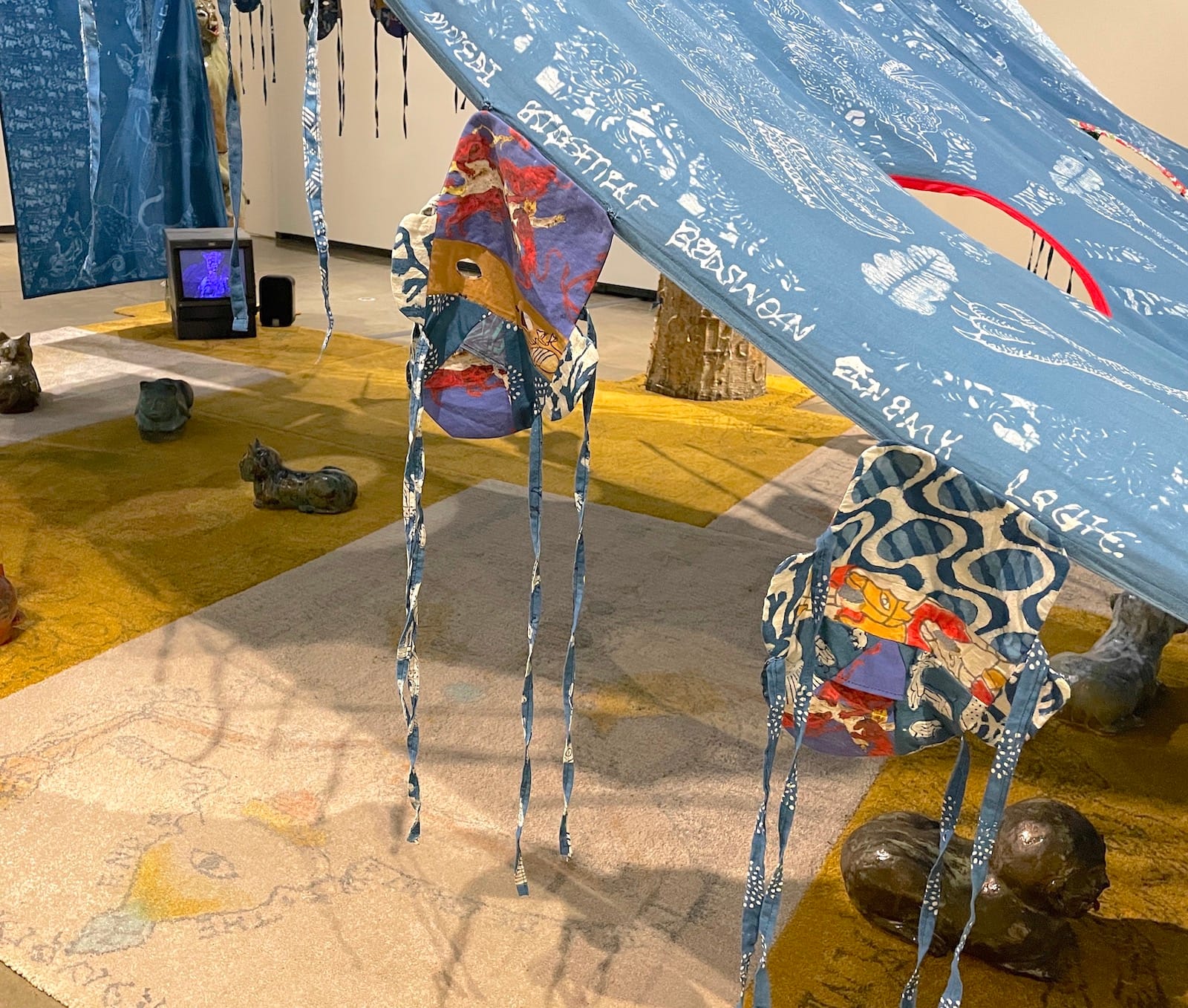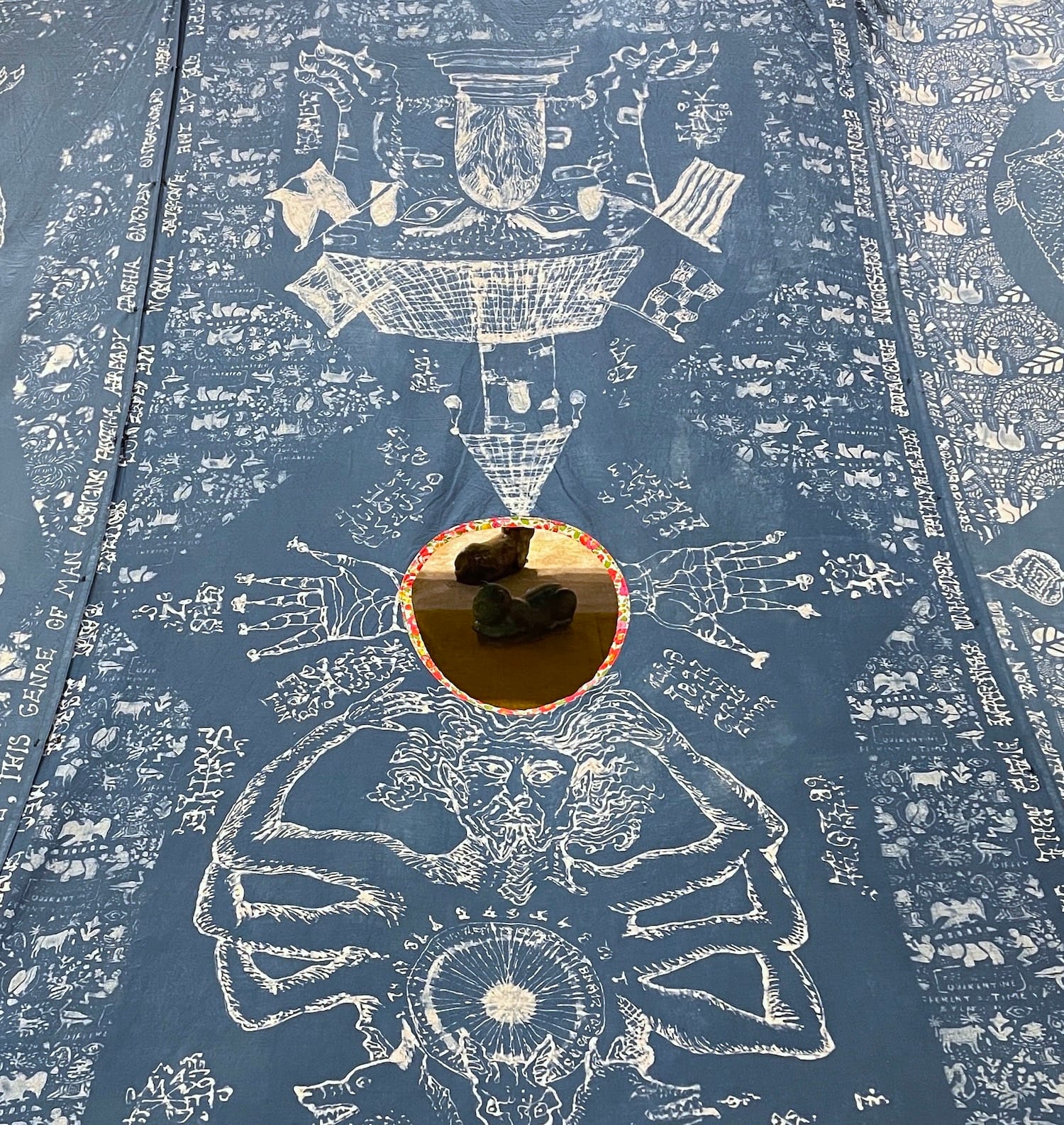 The exhibition’s central installation, for which the show is titled, is an elaborate modular recreation of the animation’s digital canopy and its hybrid demon companions. Undulating sheets of indigo-dyed textiles recount real and invented multi-species stories through laboriously hand-drawn and stenciled images made using glutinous rice paste, a Japanese resist-dye technique. A woman is digested by burrowing worms and spotted frogs; three-headed canines snarl and snap; and mischievous felines dance with long-tongued demons.