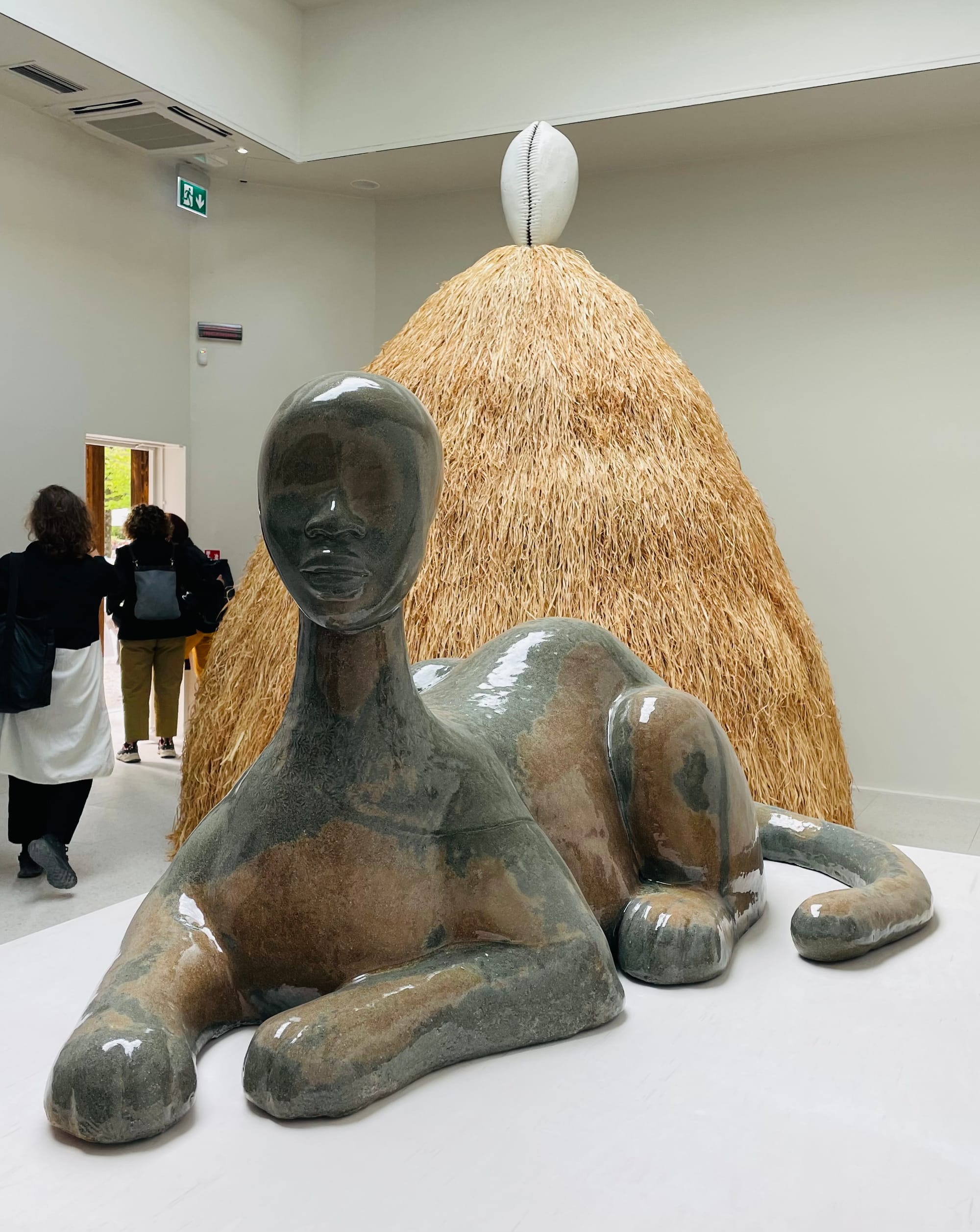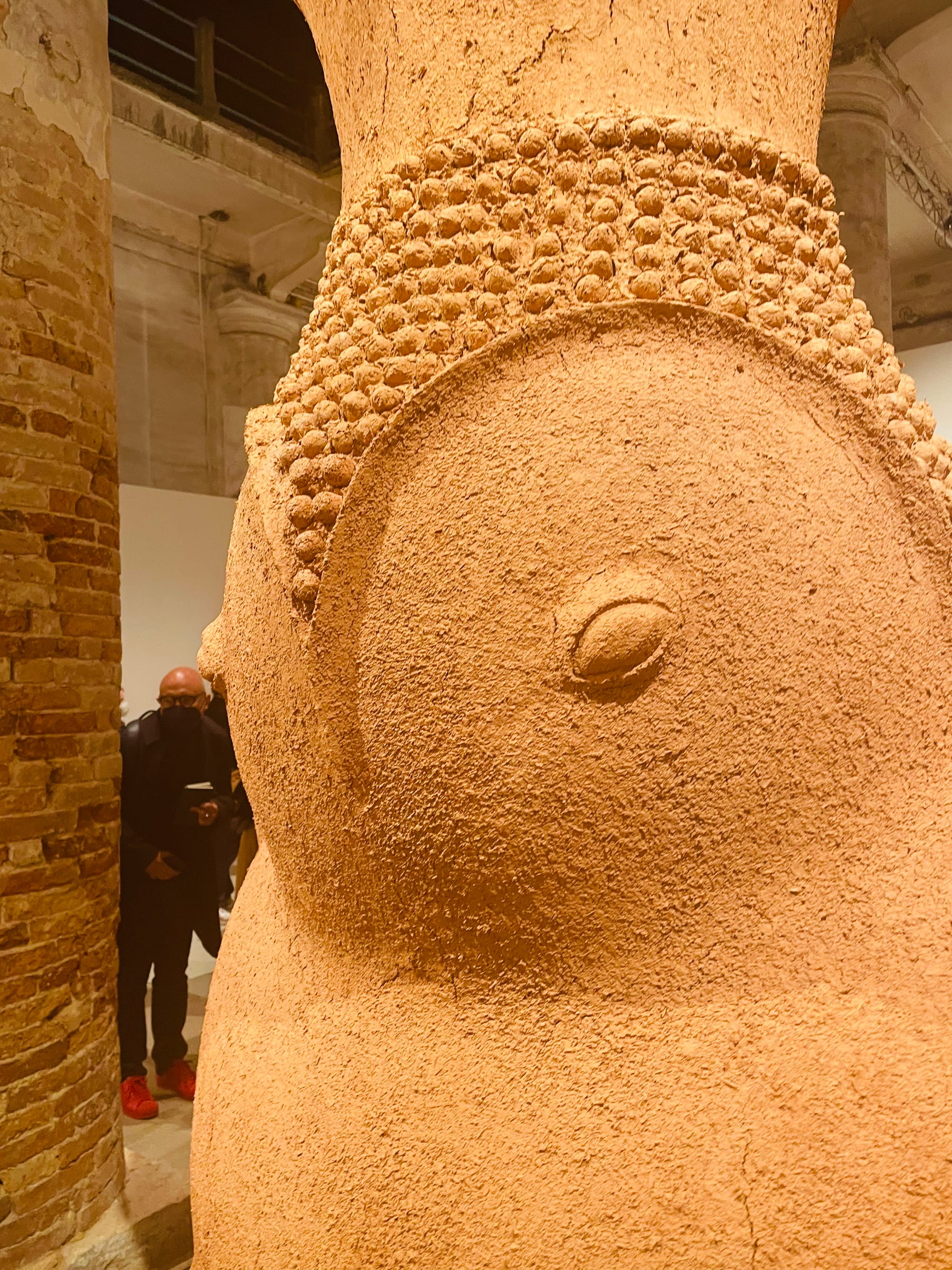 Simone Leigh, a dear friend of mine since our convergence at Creative Time some years ago, presents a world-altering US Pavilion. The wholesale transformation of the Pavilion’s neoclassical façade into a wood-columned, thatched roof edifice is inspired by 1930s West African palace architecture and treats the building itself as one of her sculptures. The highly specific groundedness of Leigh’s project, titled Sovereignty, contains a diversity of ceramic and bronze sculptures, both abstract and naturalistic female forms, others featuring jugs, raffia, and cowrie shells. The installation is augmented by a moving film of ritual burning. Sovereignty connects the dots between the artist’s stated devotion to Black femme subjectivity and self-determination in a statement that is as clear as it is self-sufficient. The roots of these works feel as though they penetrate the very ground of the Giardini, tunneling through the island towards the interior of the Earth.