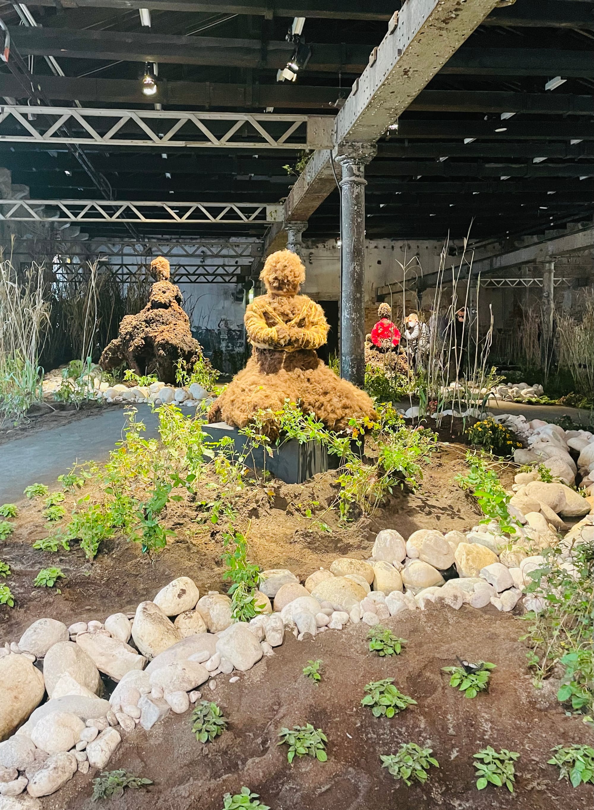 An installation that had me swooning is Precious Okoyomon’s To See the Earth Before the Evil of the World from 2022. The entirety of one of the Arsenale’s enormous spaces is transformed into an interior landscape of soil and plants (some dead, some living) pools, and streams of water, all punctuated by female figures sculpted in the earth. These attract beautiful live butterflies to their forms. The lush environment is a critical monument to kudzu and sugar cane which are both plants embedded inextricably from histories of coloniality and enslavement.