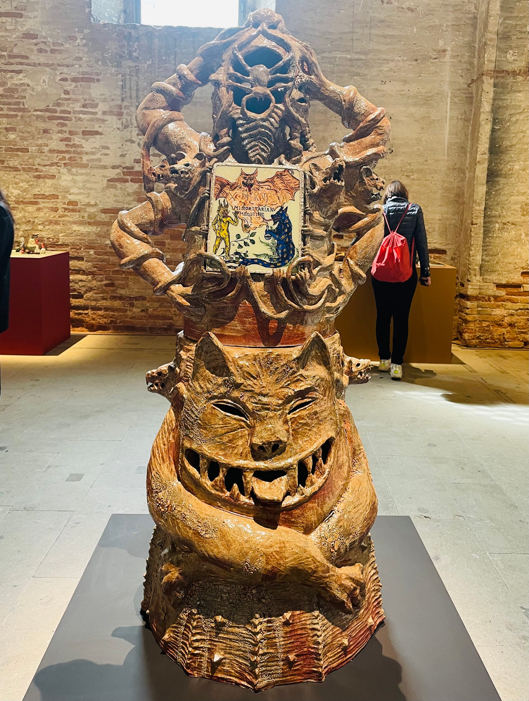 In both the Arsenale and the Central Pavilion in the Giardini, I had standout favorites. In the time capsule devoted to the question of what a vessel could be, I loved discovering the small-scale paintings of Maruja Mallo from the early 1940s which often feature shells as such containers. On a far larger scale and from 2022, Argentine artist Gabriel Chaile presented giant terracotta forms that are both vessel-like (think of enormous pitchers or ceramic pots) with bird-like features and details. Other ceramic works include Candice Lin’s altar-like figures which are vessels themselves for the materials one might need for ritual-making, including everything from dead silkworms and taxidermied iguana to crystallized copper sulfate and scented lard.