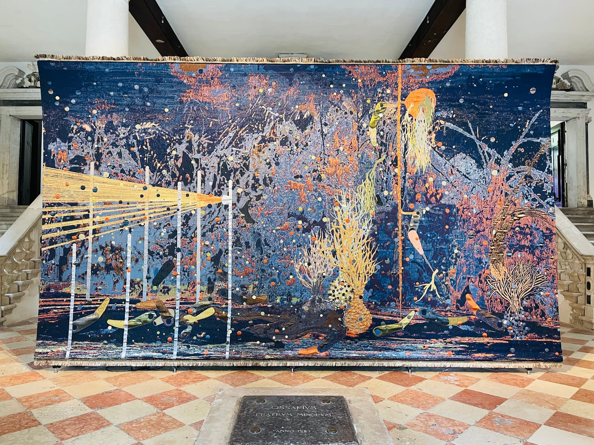 Outside of the Giardini and the Arsenale, there are three worthy projects I also wish to highlight. These include a presentation of new work by Otobong Nkanga and Anna Boghiguian at the Scuola di San Pasquale on Campo San Francesco della Vigna, a chapel slightly north of the Arsenale. Nkanga floods the entire first floor with the sound of her own voice. A large-scale tapestry, its threads, metallic and richly colored, create a landscape that evokes deep pasts and futures simultaneously. Behind the tapestry, on either side of the existing altarpiece, are poems excised into clay slabs. They speak of the earth and its capacities for renewal, through systems we understand and those that remain mysteries. On the second floor, Boghiguian’s life-sized, reflective chess board occupies the majority of the space. The chess “pieces” are free-standing cutouts of drawings of historical figures ranging from Marie Antoinette and Ludwig Wittgenstein to Bertha von Suttner and Egon Schiele.