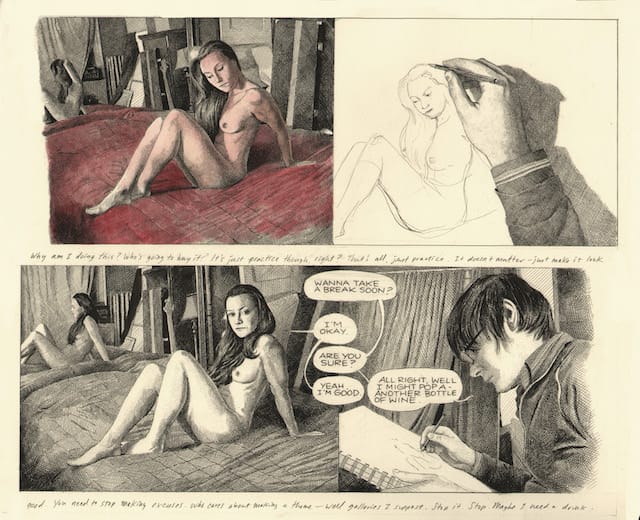 In these, the viewer is positioned variously as the model, the drawing, and the artist (and as such, the viewer reads his mind as he draws). And, when the characters’ eyes stare out to gaze at each other, as in the drawing session with the model or Karl and Anne’s first meeting in the strip from “May, 2009,” we become the medium through which the gaze completes the circuit.