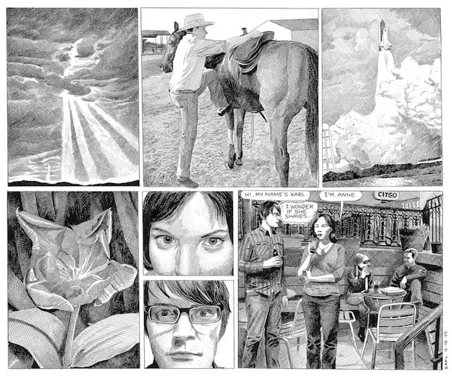 This arrangement naturally suggests the subdivided logic and geometry of Stevens’s graphic work. A strip from “May, 2009,” for instance, depicts the artist meeting a new girlfriend, Anne. Divided equally into three panels, the upper register depicts the sun coming out from behind the clouds, a cowboy getting back on a horse, and a rocket achieving liftoff. The lower register begins with another panel of the same size, of a blossoming flower. Then the pattern shifts: the next panel narrows and breaks into two, depicting closeups of the new acquaintances’ faces, their gaze apparently locked on one another. The remainder of the space is occupied by the two introducing themselves at a bar. The effect is prismatic, scattering the representation of their meeting into different modes — metaphorical, interior, and exterior, as if viewed by a third party.