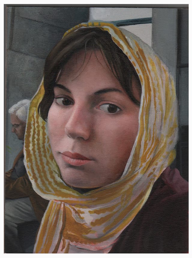 The watercolors use many of the same conventions of the strips – division into panels and text in and around the images – but replaces the crosshatching with a controlled application of pigments, making use of the liquidity of his medium only in the sky and otherwise treating it like the transparent glazes in his oil paintings. The latter are equally finished and primarily portraits, such as the one of Anne, wrapped in a scarf, looking as smooth and fresh as a new-laid egg (“September, 2009”).