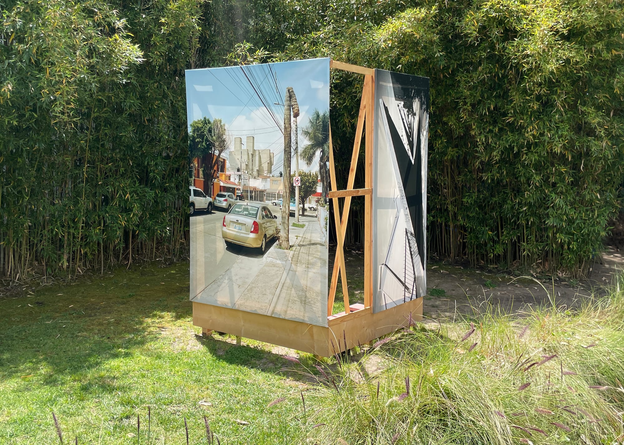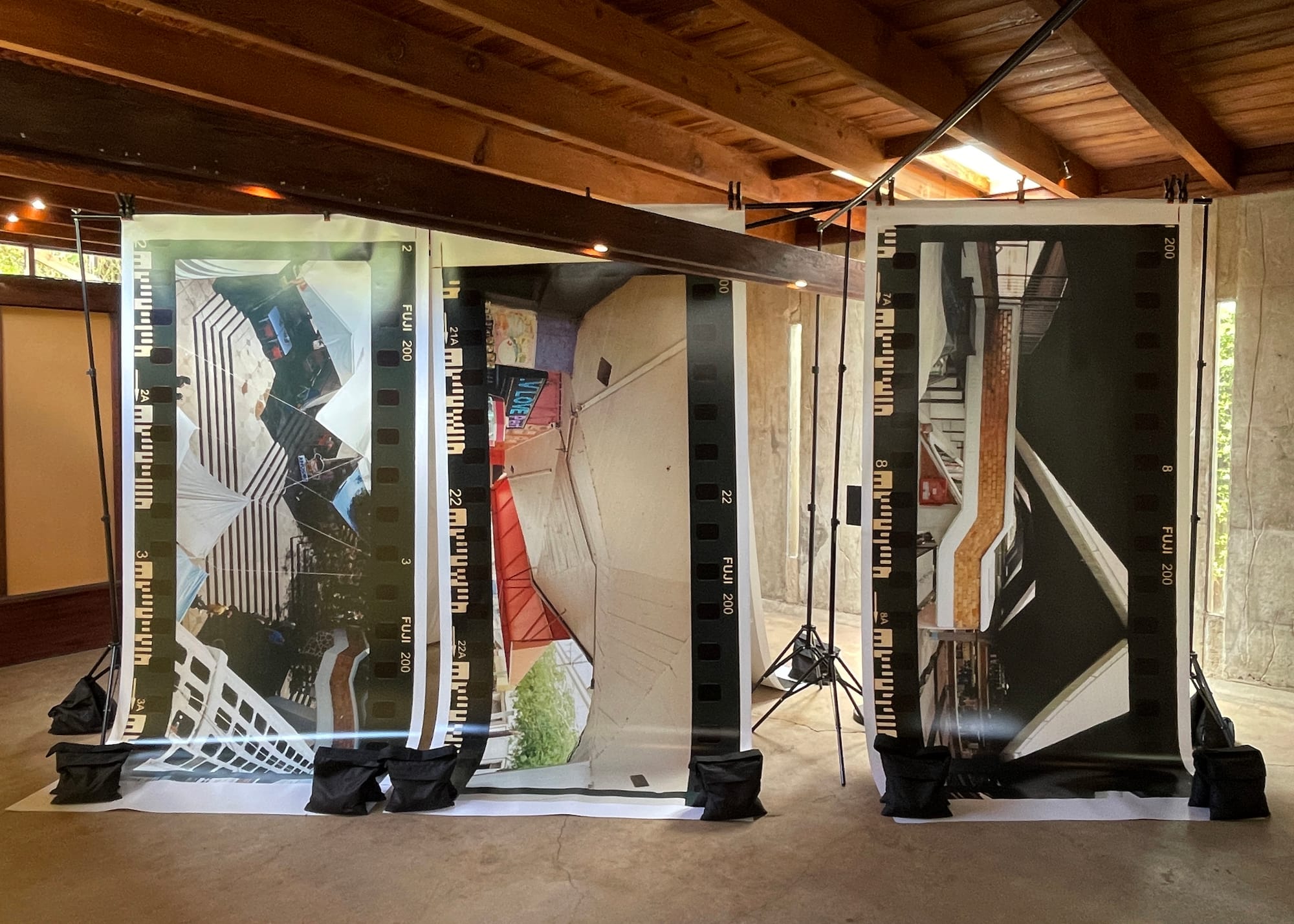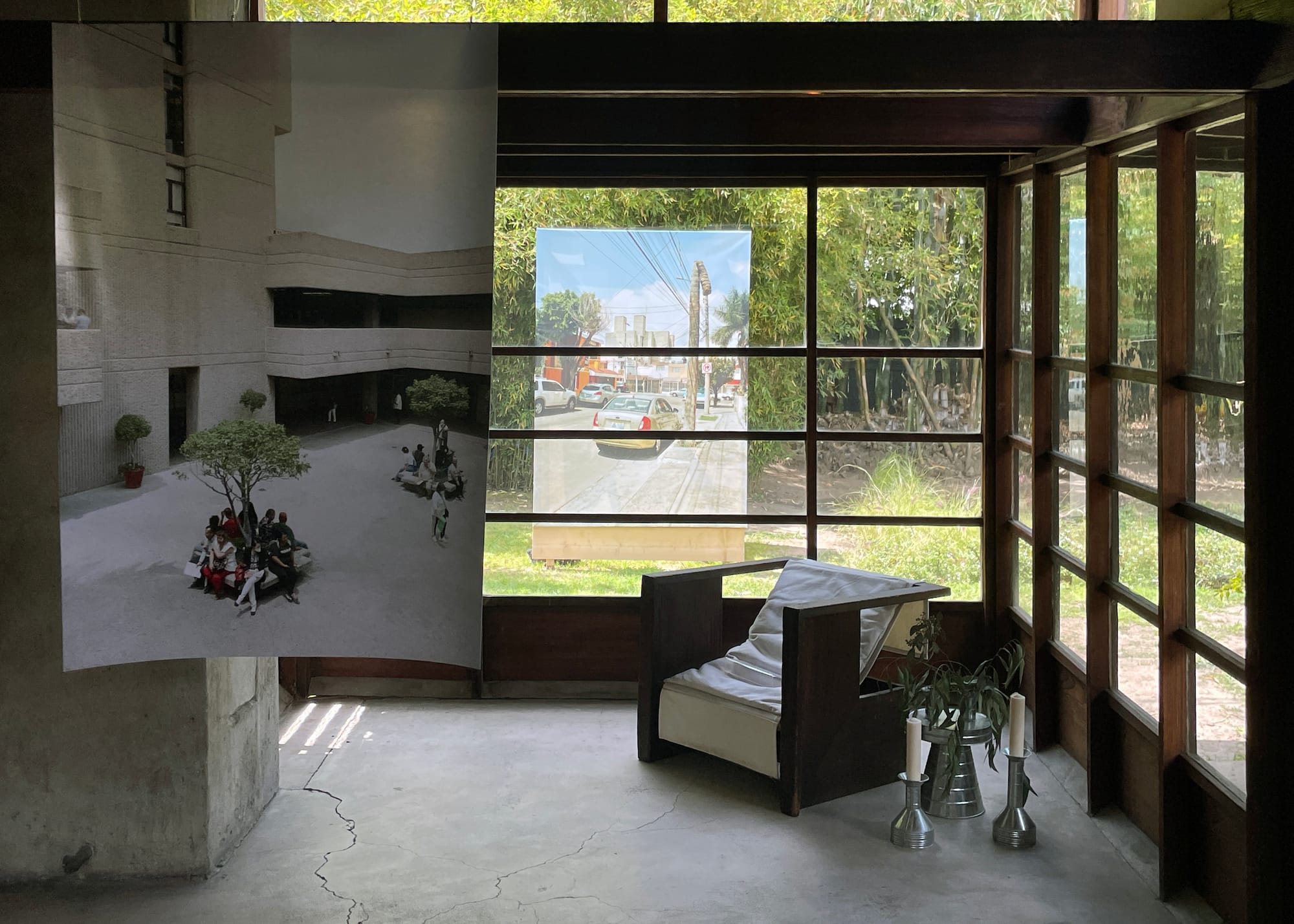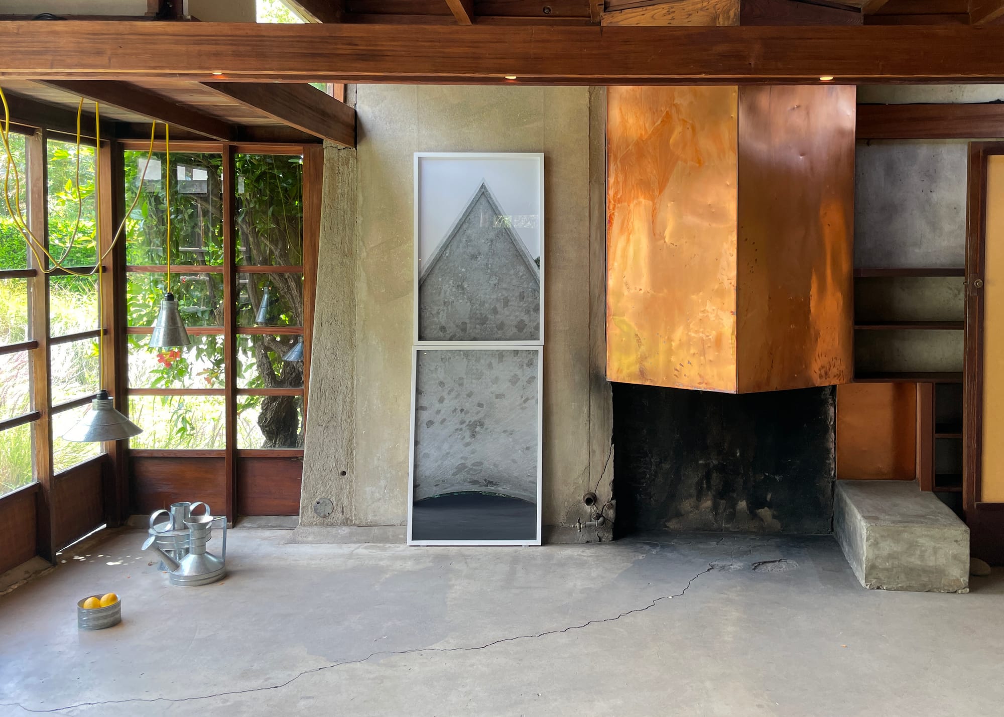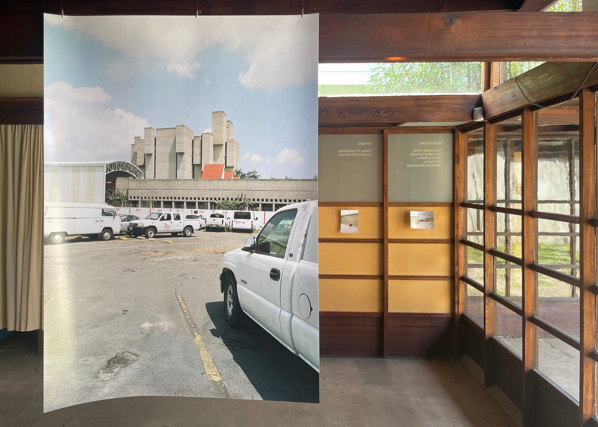 Zara Pfeifer’s “Untitled (El Archivo)” (2022) and Adam Wiseman’s “Orden / Caos” (2022–23) set up parallels between Zohn and Schindler, showing why this property was a natural fit for the exhibition. Their photographs of two Zohn designs, the hall of records, Archivo del Estado de Jalisco — “El Archivo” to locals — and a public bandshell, Concha Acústica, focus on the long, winding steps and the rectangular facades in the structures. They match the low-ceilinged, stretched body of the Schindler House and the wood beams and panels that segment the home. Most of the photos are small and delicately hung from the support beams, and waft in the breeze.