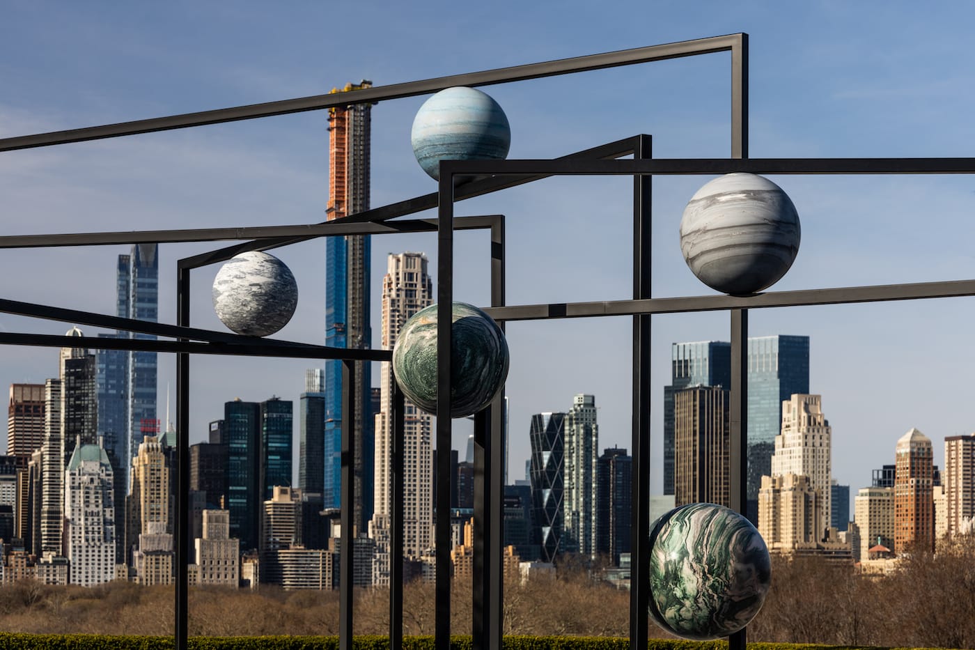 An artist whose work confronts the laws of physics, Kwade’s work can leave viewers feeling off-balanced and dizzy. Originally, the Met approached the artists with the rooftop opportunity, wanting something akin to her “WeltenLinie” presented at the 2017 Venice Biennale. A labyrinth of mirrors set within a steel skeleton, a Borgean rock garden of painted boulders, the installation questioned the rights to reflection that inanimate objects have, if any. Thankfully, the artist has removed the mirrors and simplified the concept for her rooftop commission, which indicts the city skyline in a power struggle with the stars.