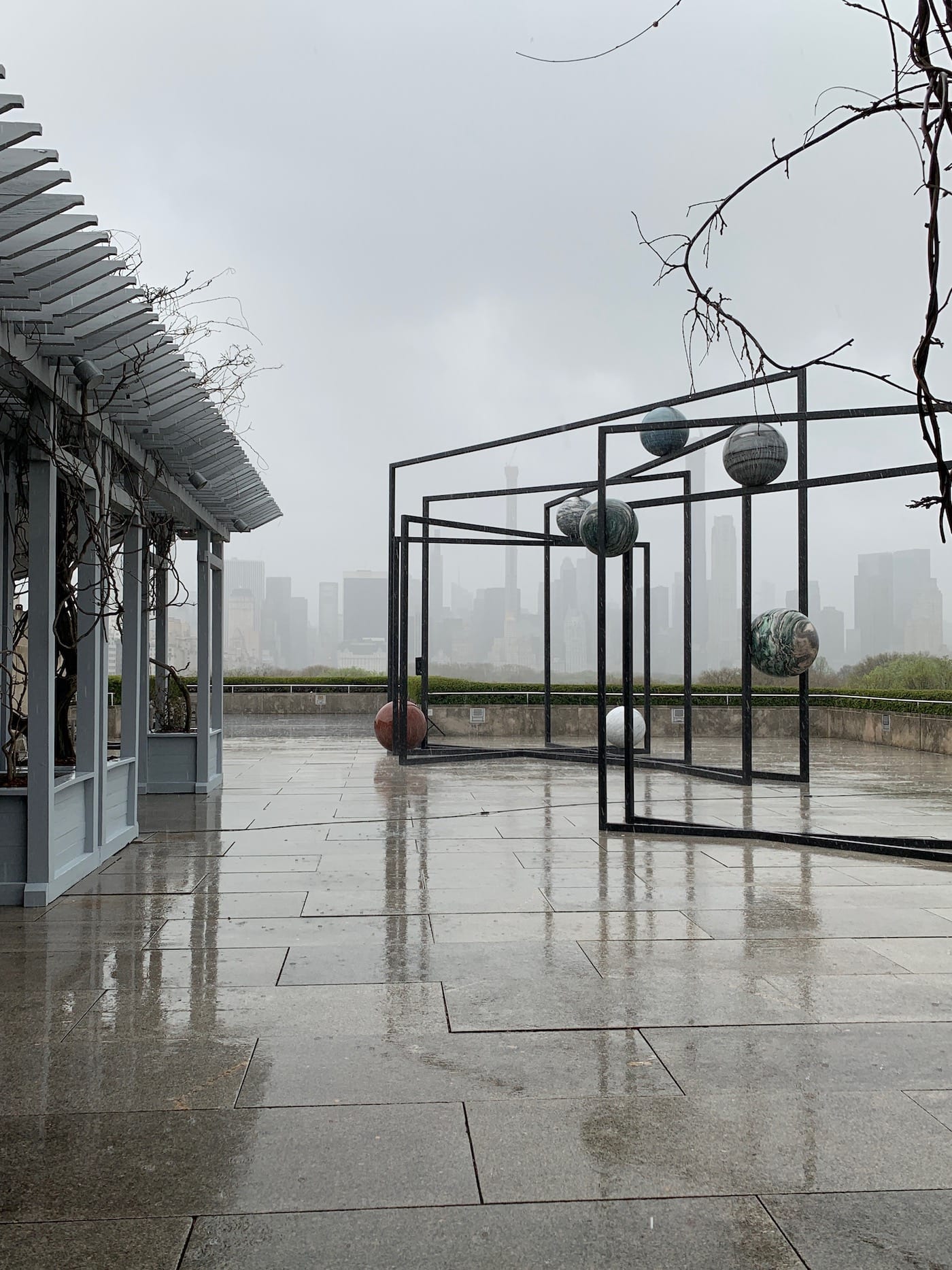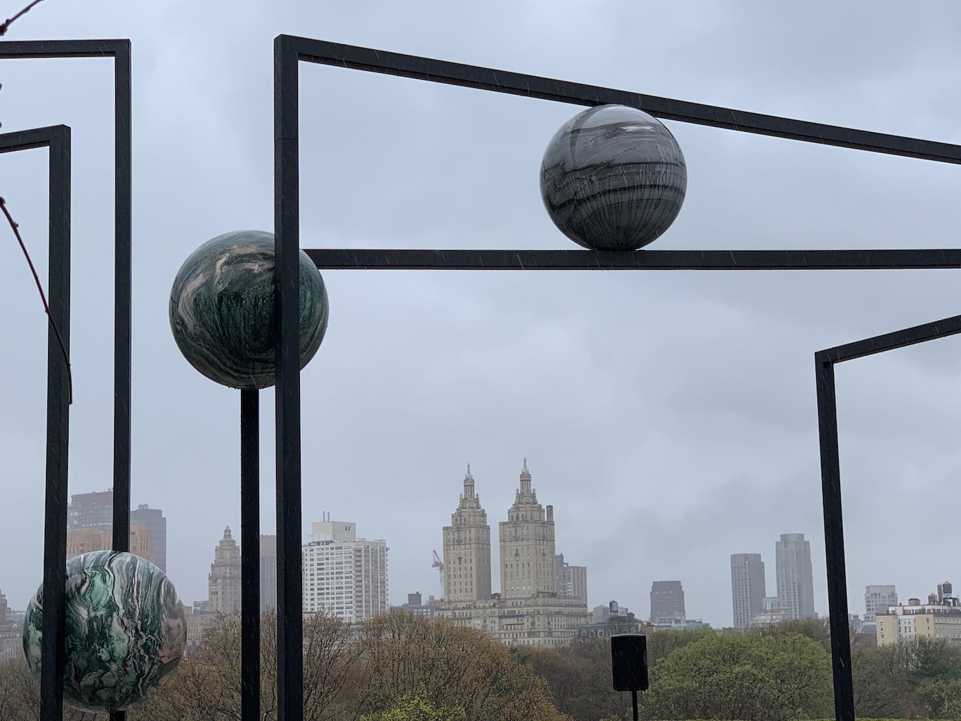 When I visited the artist’s installation last week, it had only been days after scientists released the first image of a black hole. This embodiment of destruction envisaged as a blurry ring of red-hot energy, stayed imprinted on my mind as I reached the rooftop. Suddenly the skies quickly changed into a tempest of clouds that released an intense torrent of rain. The cityscape vanished into the grey until all that remained visible were Kwade’s sculptures and the trees. But despite the high winds, the marble planets stayed suspending in midair, motionless but imposing.
