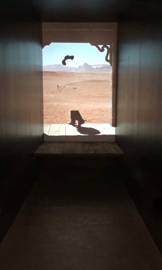 The final indictment in Despain’s work implicates the viewer, and all those that deified the landscape by consuming its culture. “Monument” (2020) takes the form of a digital film fragment derived from a John Wayne Western. Here, Despain has edited the content and deleted Wayne’s hefty body, leaving only his signature cowboy hat and boots to swagger off into the sunset. A label explains that the cast and crew of Westerns filmed in this region received fatal exposures to nuclear dust, precipitating their early deaths. Repeating endlessly on a loop like the half-lives of deadly isotopes, only Wayne’s accoutrements remain to complete the scene. By obliterating Wayne’s body, Despain denies us of our beloved hero and implicates those who turned a blind eye to its irradiated landscape. Further omissions continue today. While Hiroshima, Nagasaki and Chernobyl all have monuments to remember victims of their nuclear histories, no such memorials exist in the US Southwest.