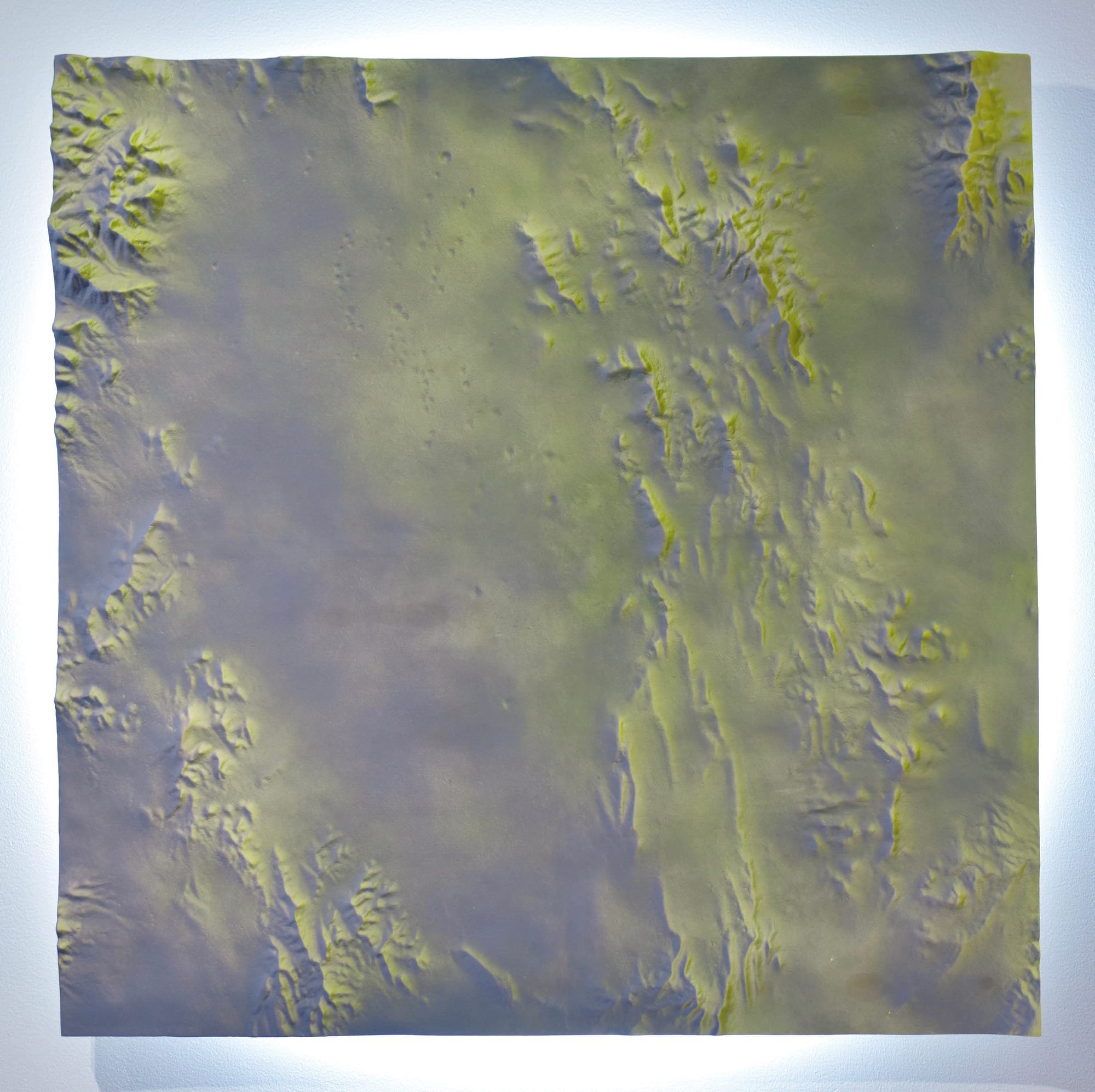 Visitors are introduced to the magnitude of the phenomenon in “Iodine-131” (2020), a low relief sculpture that hangs on the wall. Created by feeding Google satellite imagery of the 1360 square mile Nevada Test Site into a 3D printer, the resulting 4 x 4 foot topography is printed in gypsum concrete and reveals a central plain flanked by two mountain ranges. Looking closer, one notices the hundreds of pockmarks dotting the geo-accurately rendered area. The realization that these depressions still exist today as massive craters formed by the nuclear detonations is chilling, their numbers unfathomable.