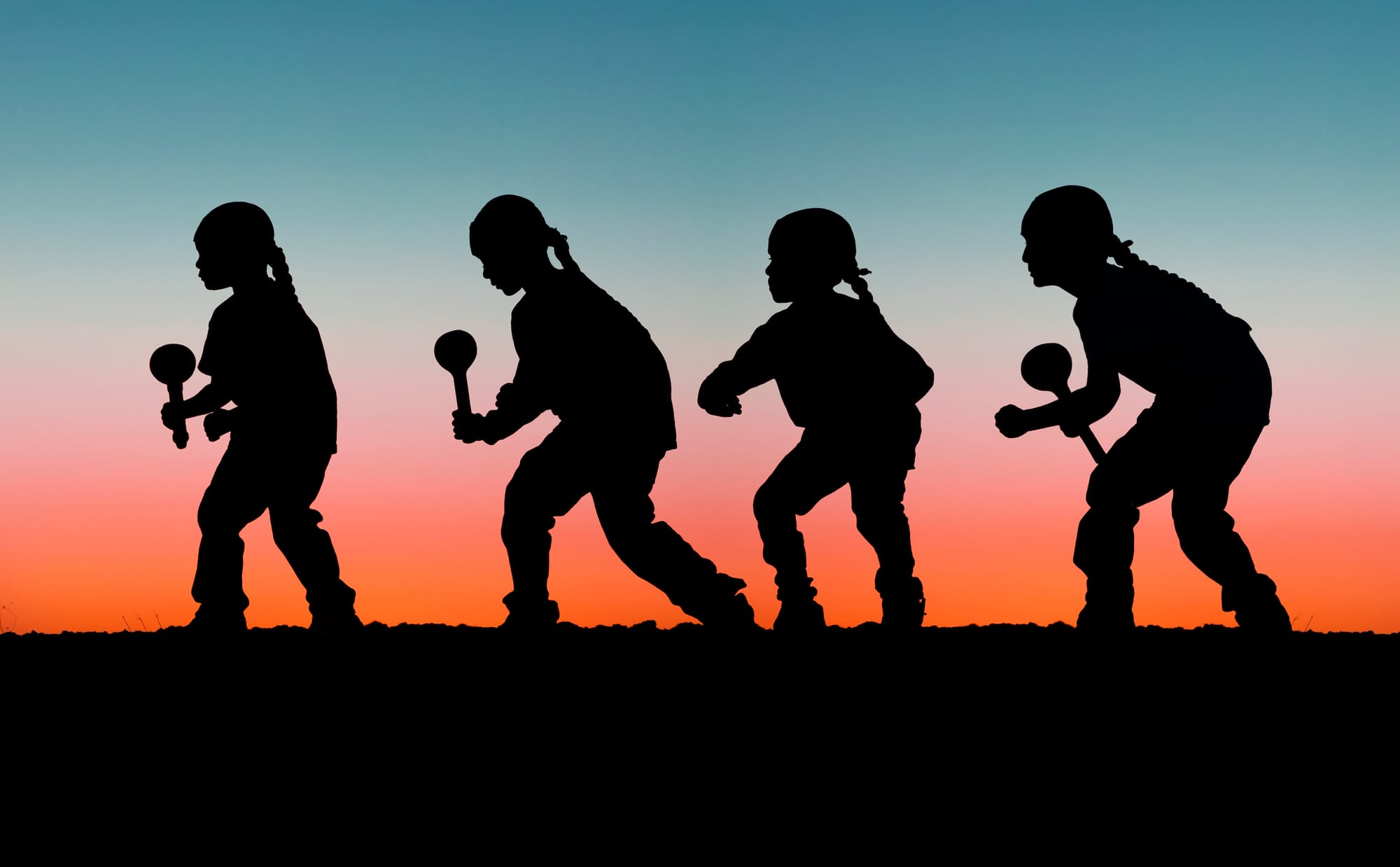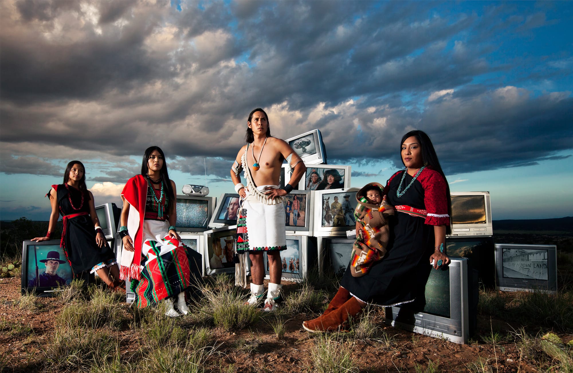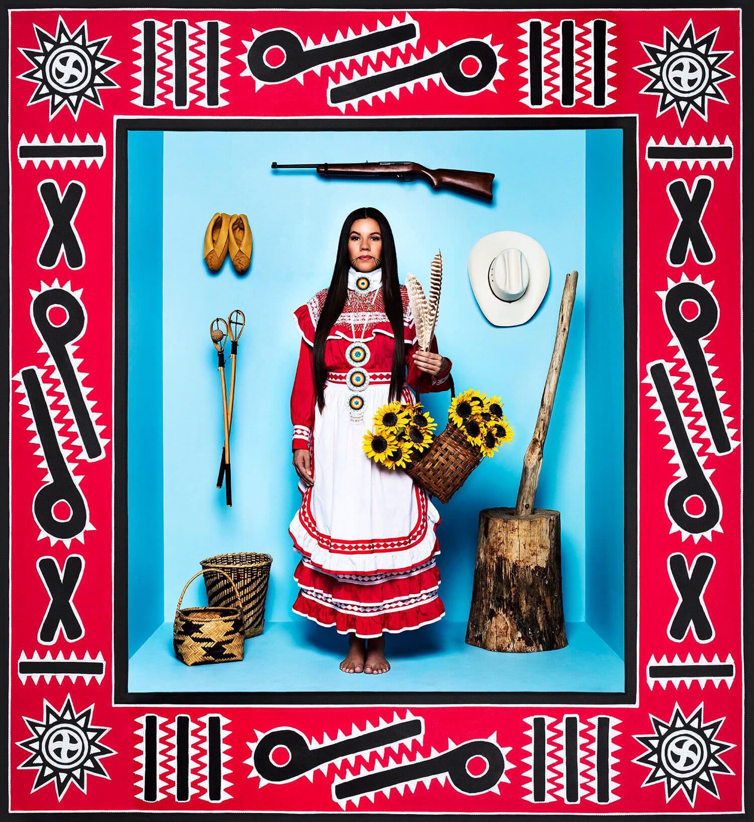 Romero’s non-realist photography prioritizes storytelling and imagination. Her portrayals use contemporary models and pop culture references to challenge Native stereotypes with complexity, vitality, and often, playfulness. Her goal is to “indigenize photography” by using a colonizing medium for liberation and expression; it’s also why “free, prior, and informed consent” is vital to her work. Romero’s photographs honor relationships with her community, and she works to ensure that sitters and elders have input on portrayals so that the result is collaborative, representative, and never exploitative. Her First American Girl series, for example, styles modern Indigenous women like dolls in boxes, surrounded by symbols of their identity and relationships: a cowboy hat, a basket, a gun, a drum. The specificity, individuality, and strength of each photograph presents a stark contrast to rows of blandly identical Barbies or the offensive elisions of mass-produced dolls meant to represent Natives.