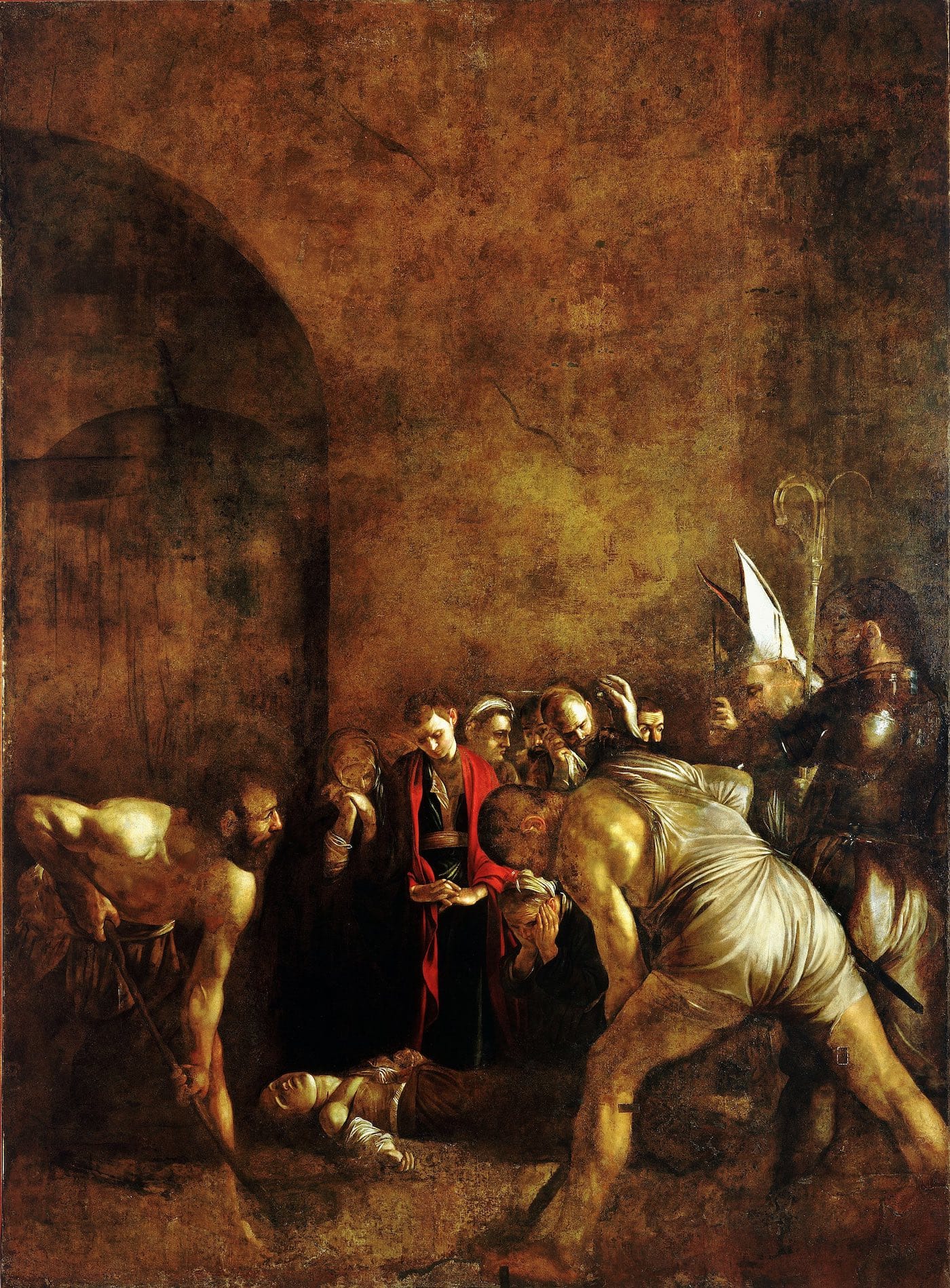 The narrative thrust of the painting arises from the gravedigger on the left, who lifts his head from his task to witness a mitered bishop, jammed into the right edge of the canvas, blessing the corpse. The regret passing over his face indicates that he has embarked on the path to redemption, like the Good Thief executed with Jesus on Golgotha, while his unperturbed companion puts his shoulder into the job.