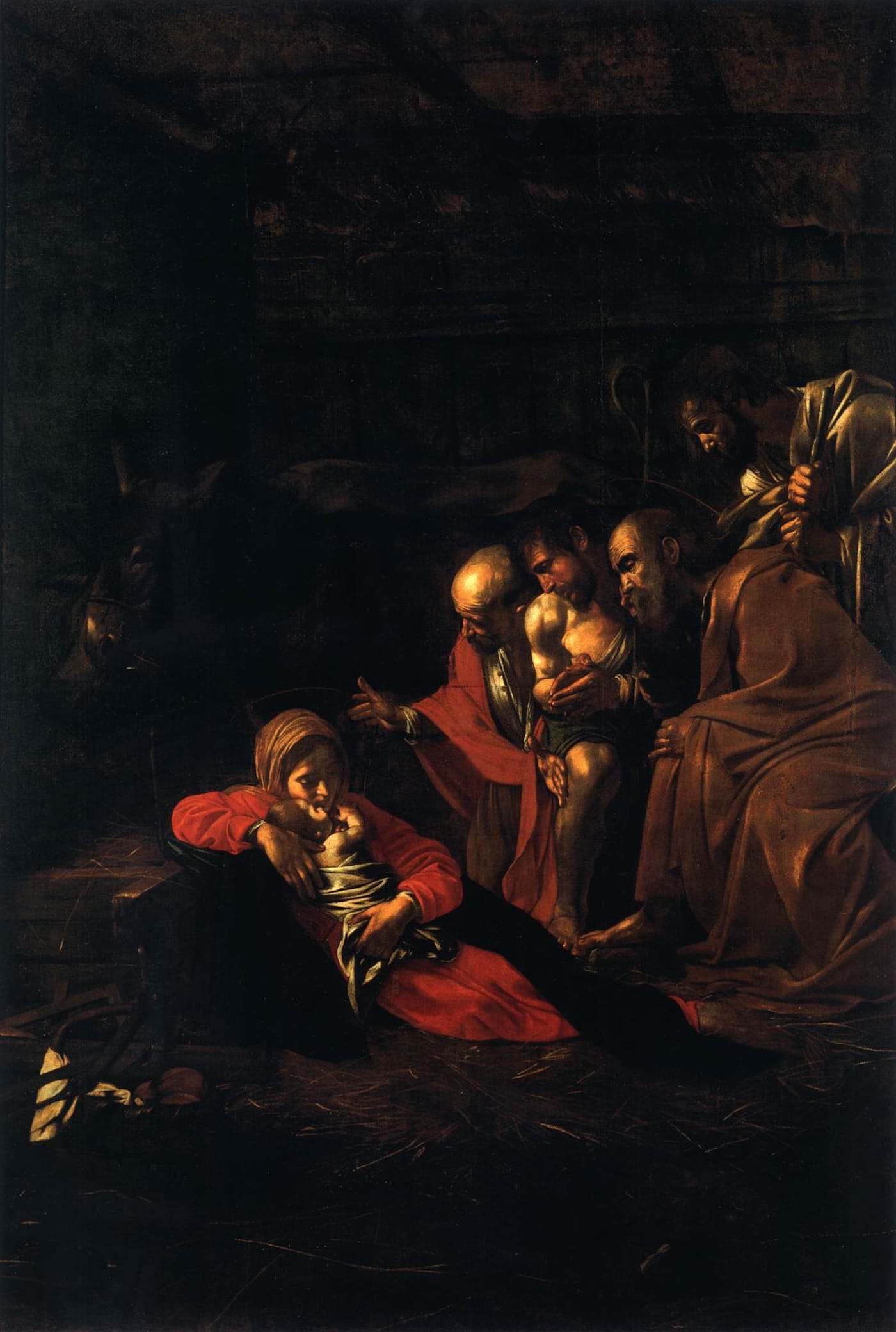 The paintings of Saint Jerome and of the Adoration are pierced by crystalline beams of light, freeing their figures from the surrounding darkness, while the actors in the other three, depicting by turns a murder, a burial, and a resurrection, seem to be losing their battle with the shadows.