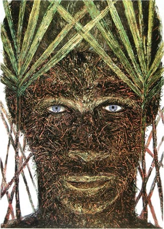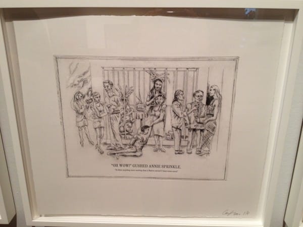 Even though I found the exhibitions organization overwhelming, I still found many works that illuminated the state of Caribbean culture and identity today without any need for explanation. I particularly liked Coco Fusco and Paula Heredia’s hysterical film “The Couple in the Cage: Guatinaui Odyssey” (video, 1993) and Fusco’s related etchings The Undiscovered Amerindians (2012). Dressed up as unidentifiable natives in cages placed in art galleries and other locations, Fusco and Heredia played on viewer’s interactions and cultural assumptions of them as savage natives. The etchings show some of the more notable reactions that are documented in the film, including the fact that a viewer offered to pay $10 to feed the artists a banana at the Whitney Museum.