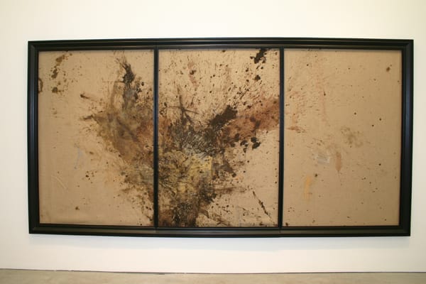When I walked into Gavin Brown to check out the show the first thing I noticed was the smell. My mother used to give me beeswax to play with as a child, and here again was that cloyingly familiar scent. In fact it permeated everything, tying together three rooms of gruff, roughly hewn artwork. The first gallery offers up four of Nadin’s recent paintings, composed of splashy abstract washes of wax, honey, charcoal, indigo and walnut paste. Nadin’s canvasses are beautiful in a way that seems almost effortless. In the third gallery was a massive square pond full of honey, dusty brown soil and ceramic, suggesting a miniature landscape complete with the texture and smell of Nadin’s farm.