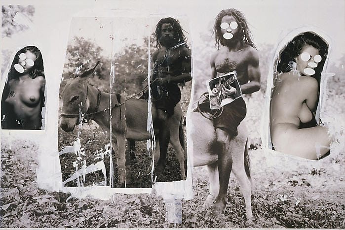 Richard Prince is a guy with scissors and a squeegee whose body of work under consideration, Canal Zone, consists mainly of Cariou’s Yes, Rasta compositions carelessly cut up and painted on, and then pasted to canvases: these derivative works comprise a childish, half-baked story-board for an as-yet-unmade film about a guy in a Rasta band.
