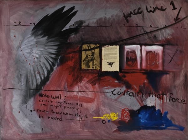 That “force” could be an internal strength, but it could also be the European colonists containing the force of the American Indians. Or it could even be the US Custom House, built under a whole banner of regulations and rules, containing the imposing chaos of Carl Beam’s work in its columned walls.