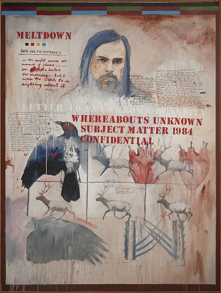 Before traveling to New York, the touring retrospective was first staged at the National Gallery of Canada, which bought Beam’s “The North American Iceberg” in 1986, the first acquisition of a contemporary work for its collection by a First Nations, which is what Canadian’s call Native Americans, artist. “The North American Iceberg” is one of the first pieces I saw upon entering the exhibit, and it has all the elements that thread through the rest of the show. There are the depictions of First Nations people from the 19th century alongside photographs of space travel and a mugshot-like portrait of the artist himself. There are the stenciled proclamations and numbers measuring across and a rectangle bordered around everything, the only elements of strict order in the piece. There is the brutal application of paint that makes me think of different types of blood spatters, the colors taking on a charred and dirty color as they near the frame. It is a storm of thundering imagery battling for the viewer’s attention, the victor not at all clear.