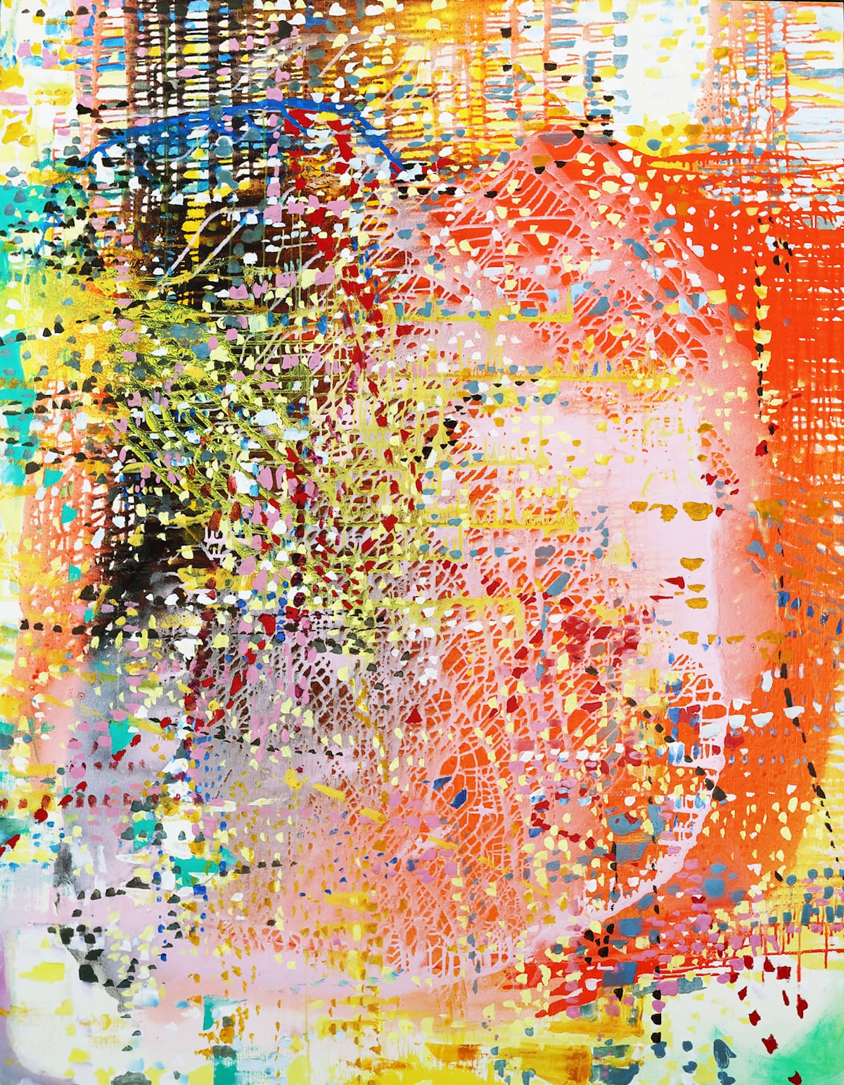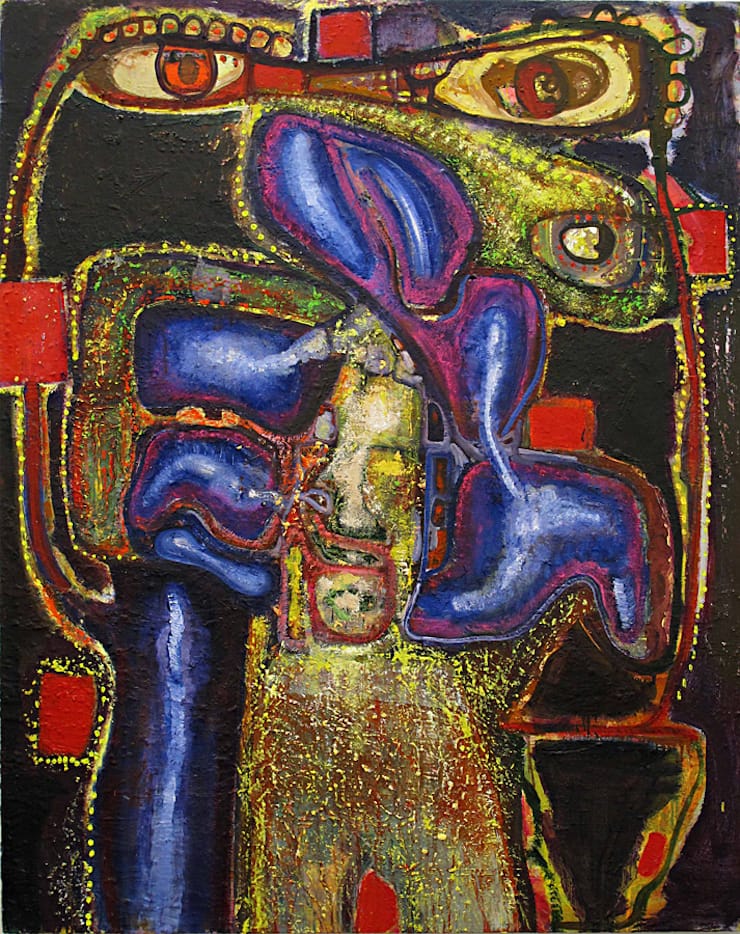 Steve DiBenedetto’s painting, “Amnesiaphilia” (2017), could also be read as an abstract portrait, with its eyes up near the painting’s top edge, and what we might read as the top of the creature’s head. Is it a mutant or a mutation that we are looking at? Do we need to give it a name because that would make us feel more comfortable?