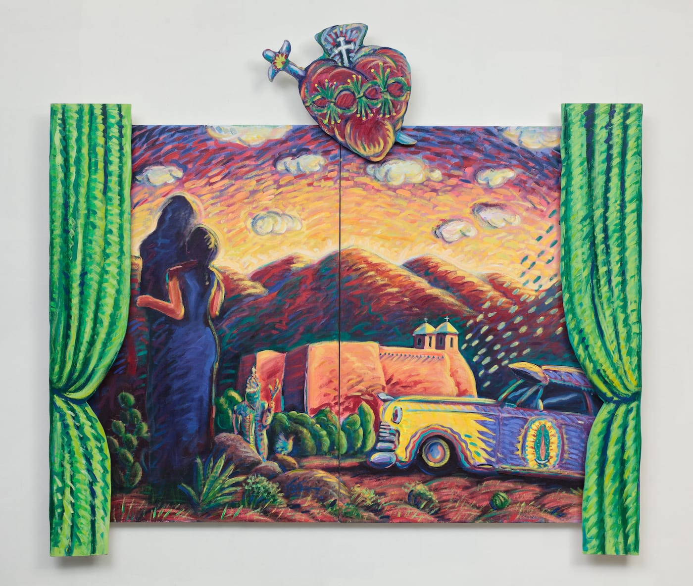 The diptych painting “Missing You” (1990) vibrates with color and energy in a neo-expressionist style. The solid structure of the San Francisco en Ranchos church occupies the central position among foothills, admired by a couple that stands in the foreground, nearly merging into one figural silhouette. Near the couple, a strange figure is roughly delineated with fine lines of bright color, next to a rooster. It is possibly a curandero: a healer responsible for blessing dry land and ailing bodies.