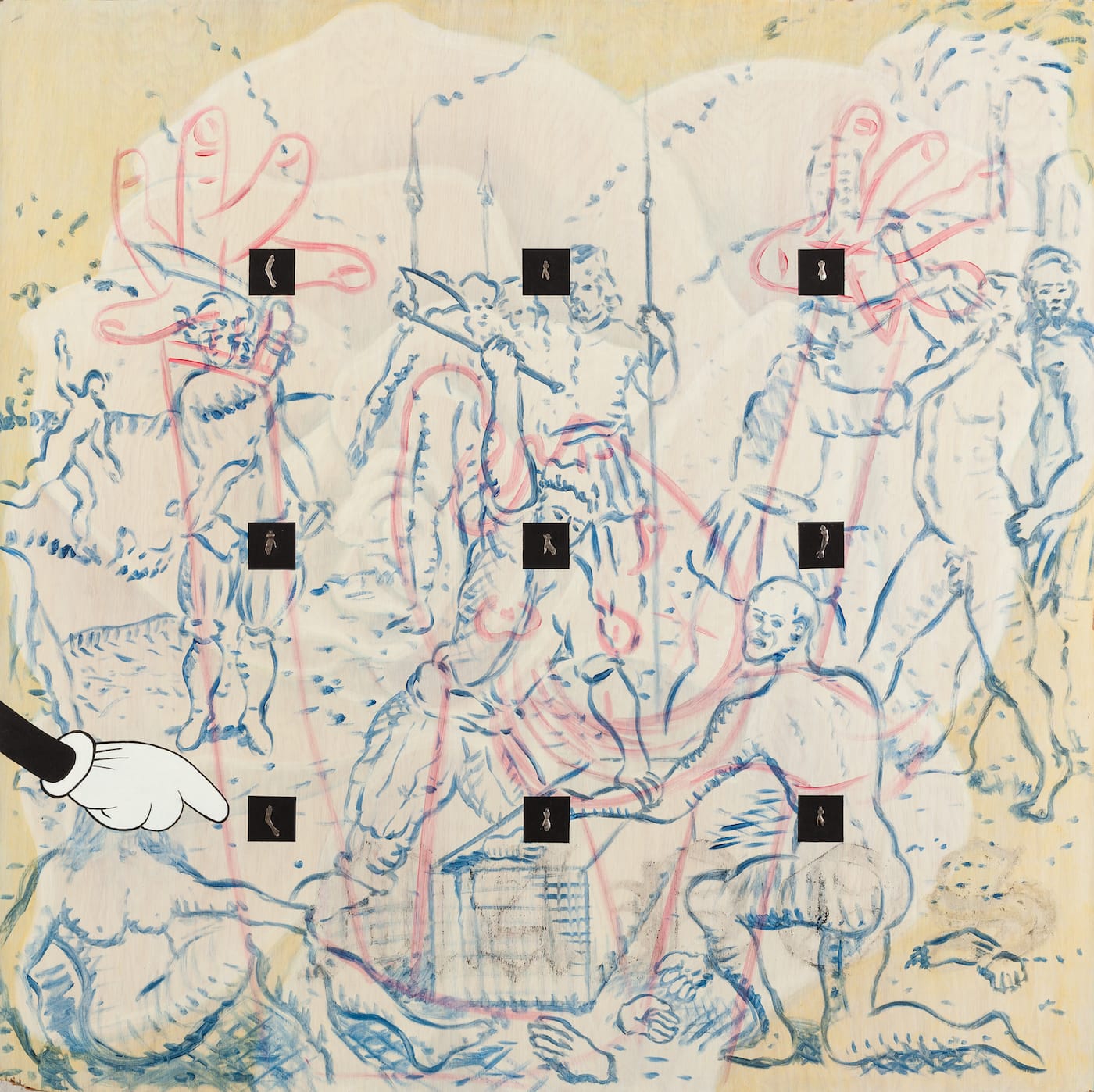 The historian and Dominican monk Bartolome de Las Casas wrote about the cruelty indigenous people endured under Spanish control in A Brief Account of the Devastation of the Indies (1542). He described the Spanish “not only stabbing them and dismembering them but cutting them to pieces.” In “Los Manos qué Curan” (1994) Frésquez documents this violent scene with a simple blue outline of forms against a white background; he superimposes a detail from Pablo Picasso’s “Guernica” (1937) in red. Interrupting the torturous vision, a grid of 9 small black boxes contains milagros of hands. These small tin Mexican charms historically depict body parts that could be left at shrines as a last resort to remedy the represented body part. Layering the distortion of cubism with historical accounts and folk art, Frésquez presents a surprising petition to heal the affliction of colonization.