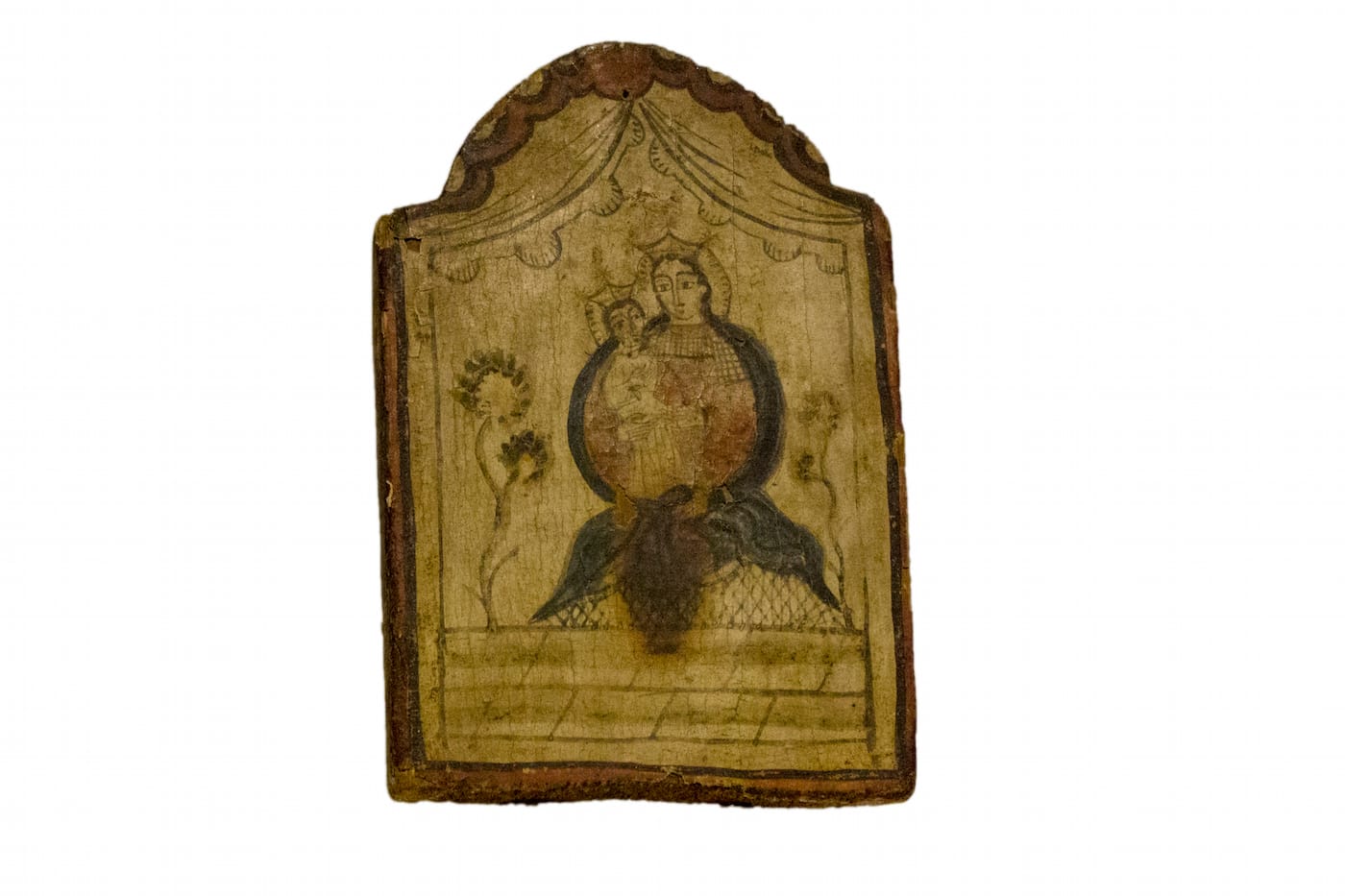 Frésquez’s roots extend well beyond the borders of Denver. As a teenager researching a school project, Frésquez found a retablo, or devotional painting, attributed to artist Pedro Antonio Fresquís. The similarity of the surname to his own led to what he calls a “culture quest,” and Frésquez’s research extended his family tree beyond Fresquís to two brothers that arrived in Santa Fe from the Spanish Netherlands in the early 1600s. Retablos originally referred to paintings placed behind church altars, but by the 12th century, the term referred to any painted work associated with a sacred image. Santos, created by santeros, typically include a holy figure framed by curtains — a design, Frésquez told Hyperallergic, that seems theatrical.