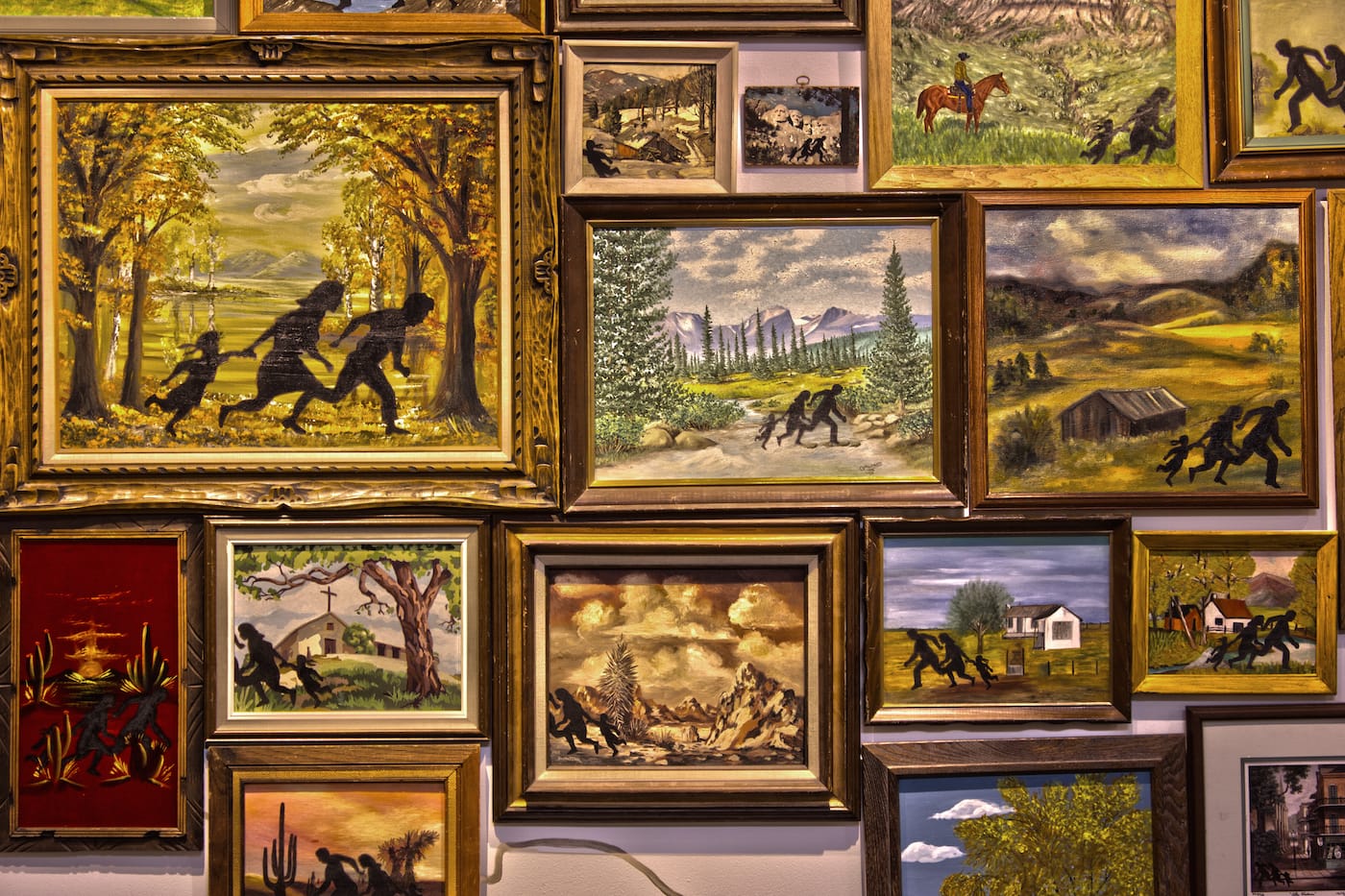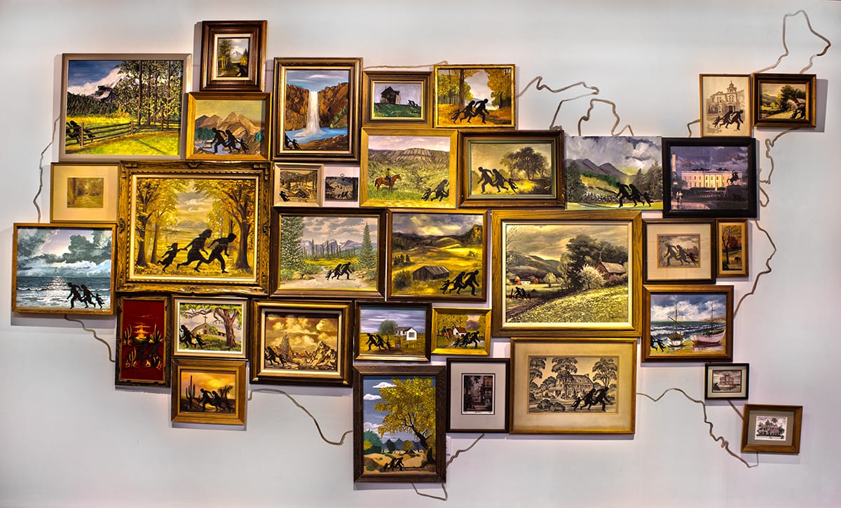 In an exhibition that includes 40 years of work, Sangre Colorado reveals Frésquez’s versatility working with multiple styles and materials. The timeline also highlights how a painting made a decade ago often assumes new meaning today. The timely assemblage “Salon de los Illegales” (2005) contains 34 found framed idyllic landscape paintings occupying the outline of the continental United States. In every scene is the silhouette of a family running. In our conversation, he said: