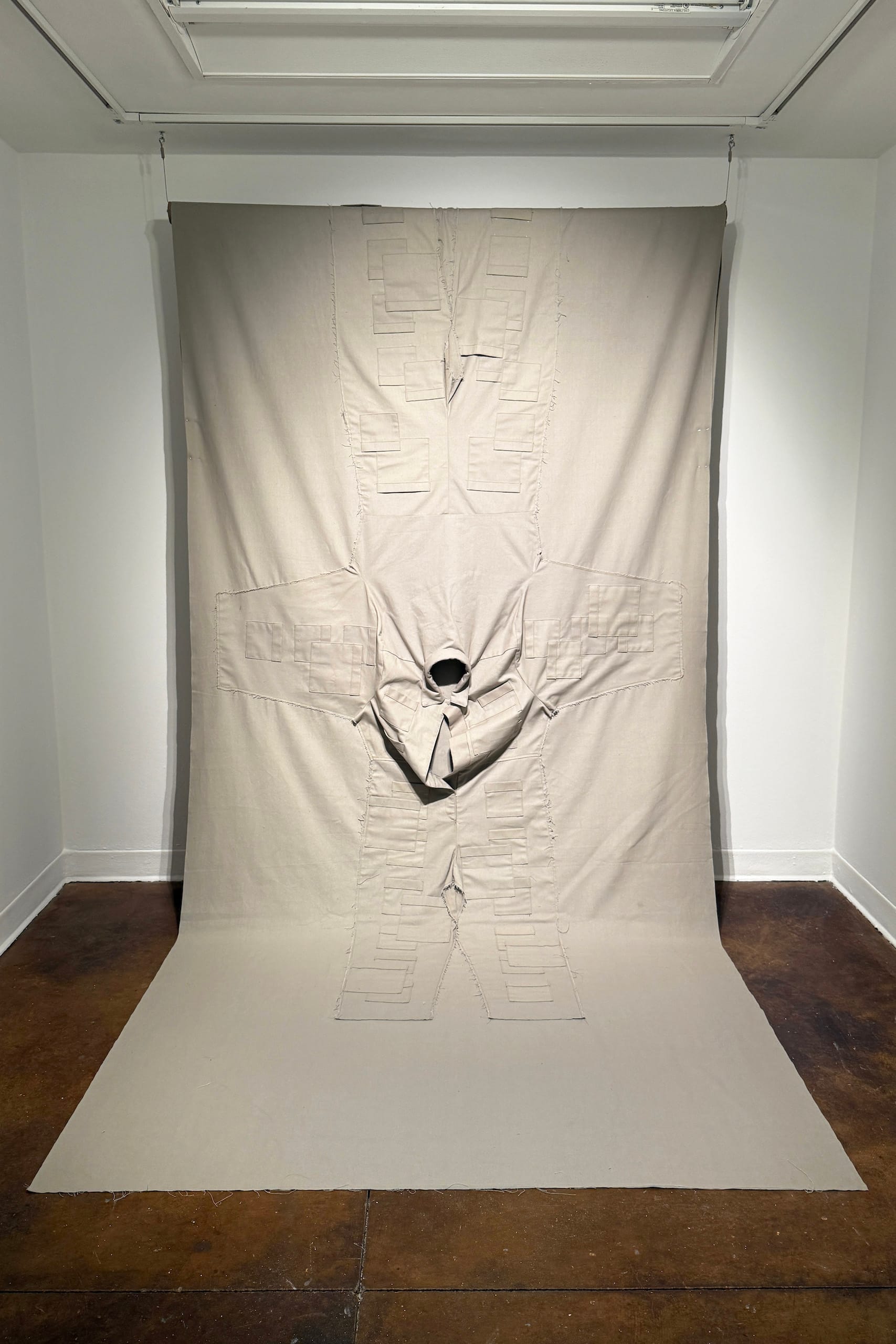 In the corner of the space is “overcast mounted jumpsuit” (2025), a length of muted gray canvas that spills down the wall and onto the floor. The front and back of the jumpsuit are appliqued onto it, split from the neck like a banana peel. The shared collar protrudes, as if a body was emerging from the surface.